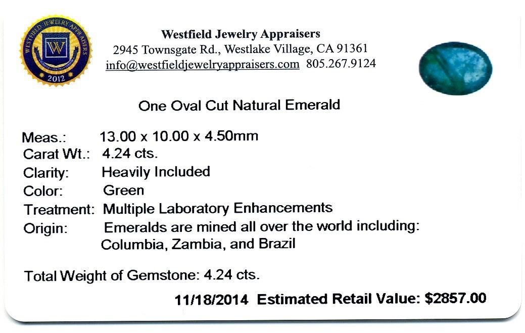4.24ct. One Oval Cut Natural Emerald Westfield Appraised at $2,857.00.