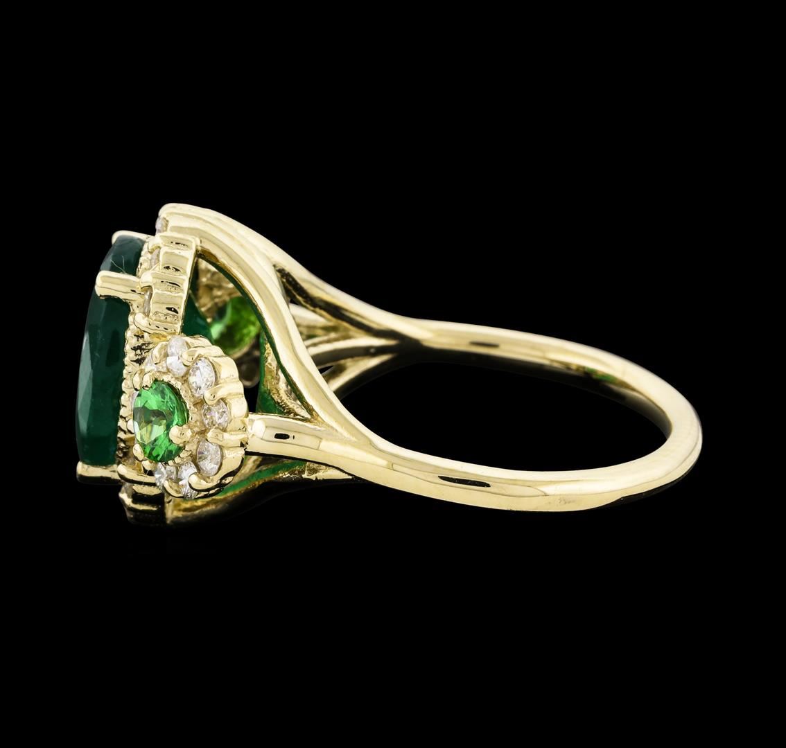 One electronically tested 14KT yellow gold lady's cast fashion ring with a three stone triple halo with a bright polish finish. The featured lady's ring has a shank measuring 1.76 millimeters wide. Identified with markings of '14K'. Condition is new, good workmanship. Containing: One prong set oval modified mixed cut natural emerald, measuring 11.24 x 8.84 x 6.08mm, (depth est.) 10%. bulge factor, approximate weight of 3.86ct., clarity is heavily included, medium dark, moderately strong, green color, (GIA G 6/4), cut is good. Transmitting light somewhat diffusely, semi-transparent to translucent. Naturally occurring internal & external characteristics are present. Indications of oil residue. Colored gemstones are presumed to have been subjected to commonly used enhancement processes. Graded in the setting. Two prong set round modified brilliant cut natural tsavorite garnets, measuring 3.50 - 3.43 x 2.25 mm, (depth est.) approximate total weight of 0.38ct., clarity is eye clean, medium, moderately strong, slightly yellowish green color, (GIA slyG 5/4), cut is good. Transmitting light with no distortion, transparent. Colored gemstones are presumed to have been subjected to commonly used enhancement processes. Graded in the setting. Thirty prong set round brilliant cut diamonds, measuring 1.70 - 1.65 x 1.04mm (depth est.) approximate total weight of 30 Stones = 0.55ct. Graded in the setting. Clarity SI-1 to SI-2. Color: H - I Cut Good. Total Weight of Colored Stones 4.24ct.. Total Weight of Diamonds 0.55ct.. Total Weight of Ring 6.30gm. GAS Appraised at $6,310.00.
