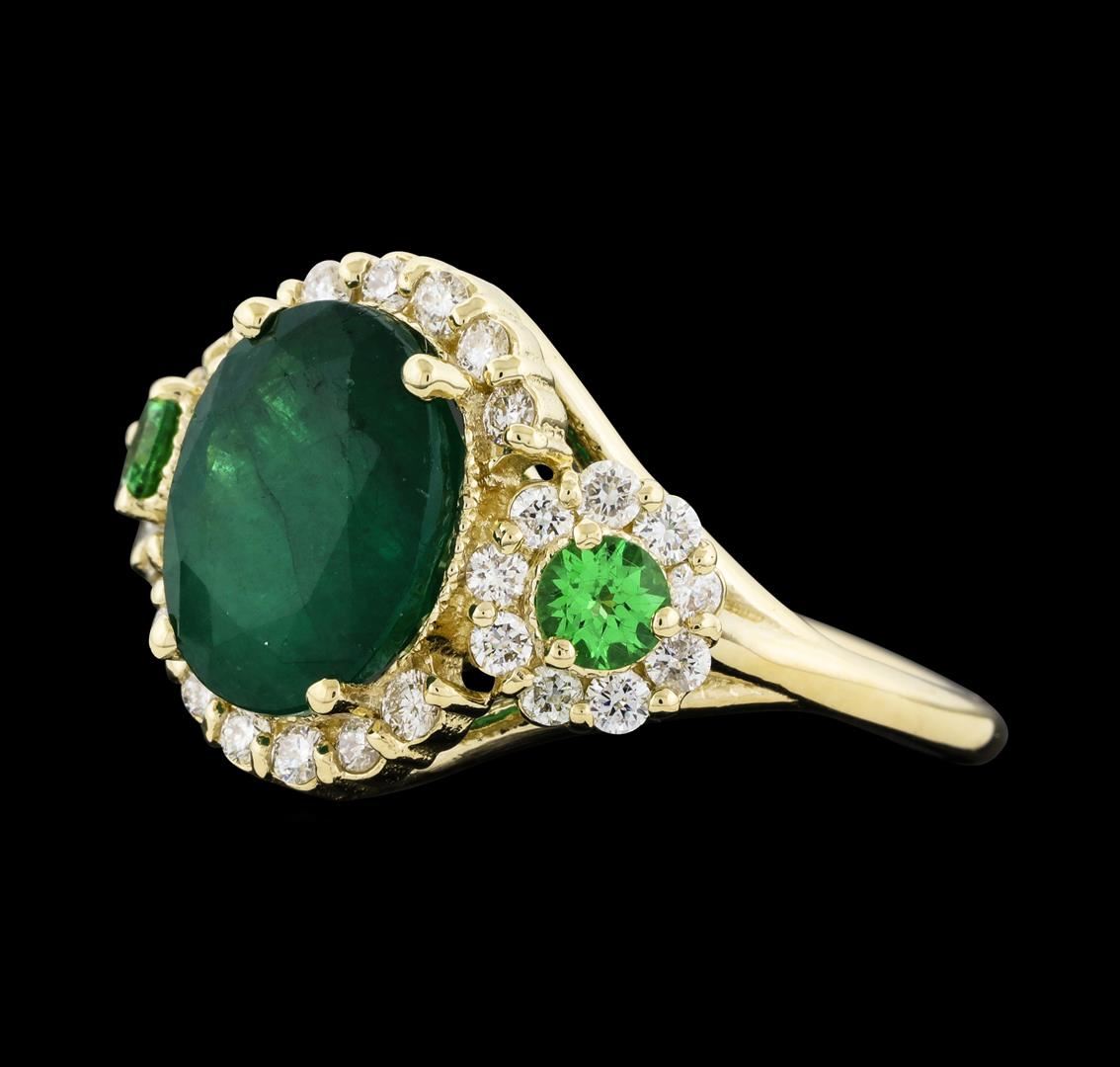 One electronically tested 14KT yellow gold lady's cast fashion ring with a three stone triple halo with a bright polish finish. The featured lady's ring has a shank measuring 1.76 millimeters wide. Identified with markings of '14K'. Condition is new, good workmanship. Containing: One prong set oval modified mixed cut natural emerald, measuring 11.24 x 8.84 x 6.08mm, (depth est.) 10%. bulge factor, approximate weight of 3.86ct., clarity is heavily included, medium dark, moderately strong, green color, (GIA G 6/4), cut is good. Transmitting light somewhat diffusely, semi-transparent to translucent. Naturally occurring internal & external characteristics are present. Indications of oil residue. Colored gemstones are presumed to have been subjected to commonly used enhancement processes. Graded in the setting. Two prong set round modified brilliant cut natural tsavorite garnets, measuring 3.50 - 3.43 x 2.25 mm, (depth est.) approximate total weight of 0.38ct., clarity is eye clean, medium, moderately strong, slightly yellowish green color, (GIA slyG 5/4), cut is good. Transmitting light with no distortion, transparent. Colored gemstones are presumed to have been subjected to commonly used enhancement processes. Graded in the setting. Thirty prong set round brilliant cut diamonds, measuring 1.70 - 1.65 x 1.04mm (depth est.) approximate total weight of 30 Stones = 0.55ct. Graded in the setting. Clarity SI-1 to SI-2. Color: H - I Cut Good. Total Weight of Colored Stones 4.24ct.. Total Weight of Diamonds 0.55ct.. Total Weight of Ring 6.30gm. GAS Appraised at $6,310.00.