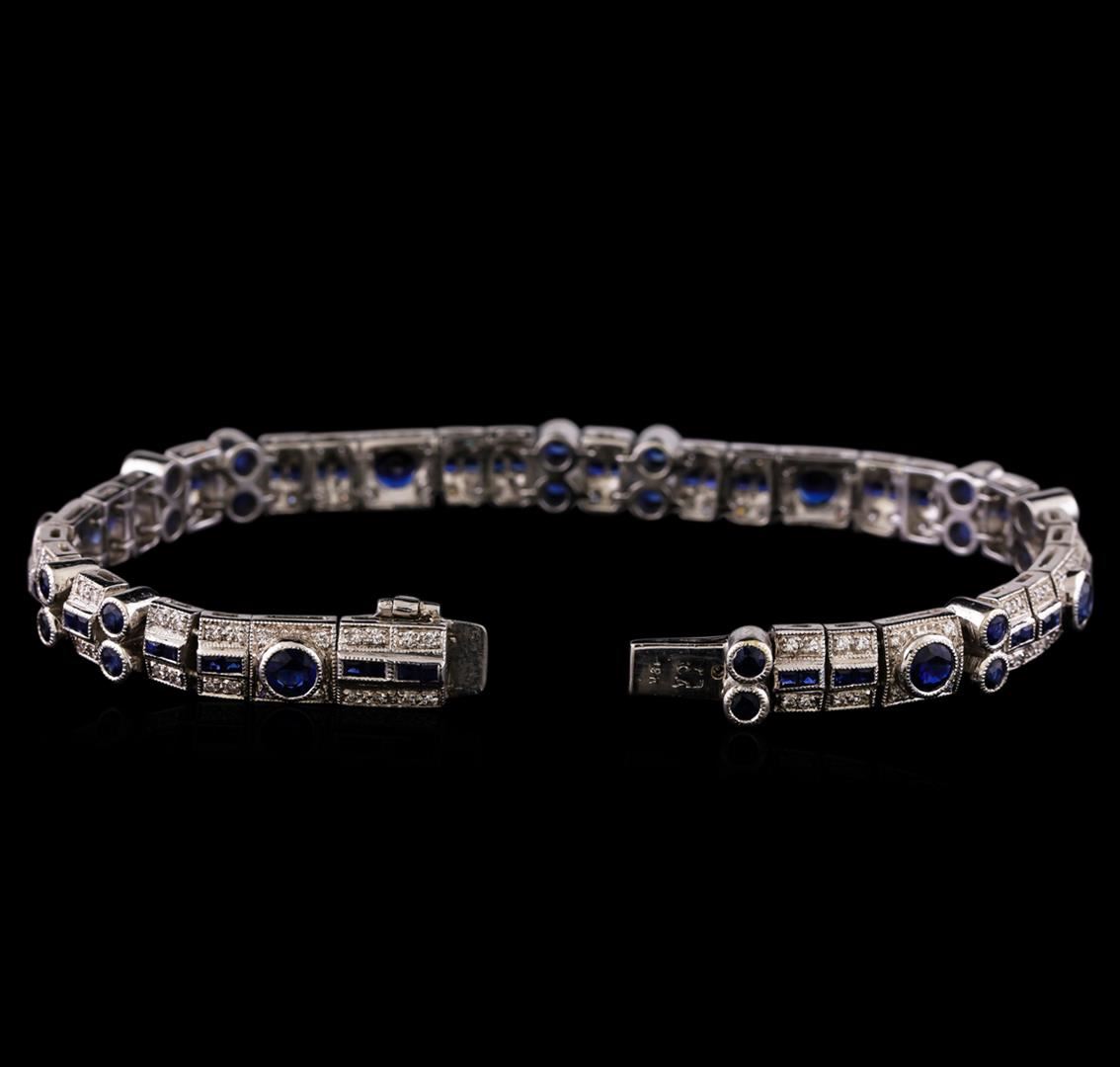One electronically tested 18KT white gold ladies cast & assembled sapphire and diamond bracelet. Seven inch length bracelet features a flexible stylized ribbon of sapphire and diamond set links, terminating in a concealed clasp with safety. Bright and patterned finish with milgrain detailing. Identified with markings of '18K'. Condition is good. Containing: Six bezel set round mixed cut natural blue sapphires, measuring 3.90 - 3.80 x 2.50 mm, approximate total weight of 1.80ct., clarity is eye clean, type II, dark, very slightly grayish, blue color, (GIA B 7/3), cut is good. Transmitting light with no distortion, transparent. Measurements & the color grade are an average for the group. Graded in the setting. Twenty bezel set round mixed cut natural blue sapphires, measuring 2.40 - 2.40 x 1.56 mm, approximate total weight of 1.40ct., clarity is eye clean, type II, dark, very slightly grayish, blue color, (GIA B 7/3), cut is good. Transmitting light with no distortion, transparent. Measurements & the color grade are an average for the group. Graded in the setting. Fifty-two channel set square step cut natural blue sapphires, measuring 1.50 x 1.40 x 0.94mm, approximate total weight of 1.04ct., clarity is eye clean, type II, dark, very slightly grayish, blue color, (GIA B 7/3), cut is good. Transmitting light with no distortion, transparent. Measurements & the color grade are an average for the group. Graded in the setting. One Hundred Twenty-Eight prong set round brilliant cut diamonds, measuring 1.20 - 1.20 x 0.72mm (depth est.) approximate total weight of 128 Stones = 0.89ct. The clarity grade reflects the entire range of clarity for this group. Graded in the setting. Clarity SI-1 to I-2. Color: F - H. Total Weight of Colored Stones 4.24ct.. Total Weight of Diamonds 0.89ct.. Total Weight of Bracelet 30.15gm. AIG Appraised at $11,445.00.