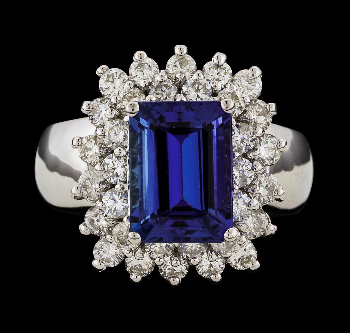 One electronically tested 14KT white gold lady's cast fashion ring with a double basket halo with a bright polish finish. The featured lady's ring has a shank measuring 4.31 millimeters wide. Identified with markings of '14K'. Condition is new, good workmanship. Containing: One prong set emerald standard step cut natural tanzanite, measuring 10.81 x 7.83 x 5.38mm, (depth est.) approximate weight of 4.24ct., clarity is eye clean, medium dark, moderately strong, violetish blue color, (GIA vB 6/4), cut is very good. Transmitting light with no distortion, transparent. Colored gemstones are presumed to have been subjected to commonly used enhancement processes. Graded in the setting. Thirty-Two prong set round brilliant cut diamonds, measuring 2.40 - 2.35 x 1.48mm (depth est.) approximate total weight of 32 Stones = 1.63ct. Graded in the setting. Clarity SI-1 to SI-3. Color: H - I Cut Good. Total Weight of Colored Stones 4.24ct.. Total Weight of Diamonds 1.63ct.. Total Weight of Ring 9.80gm. GAS Appraised at $10,840.00.