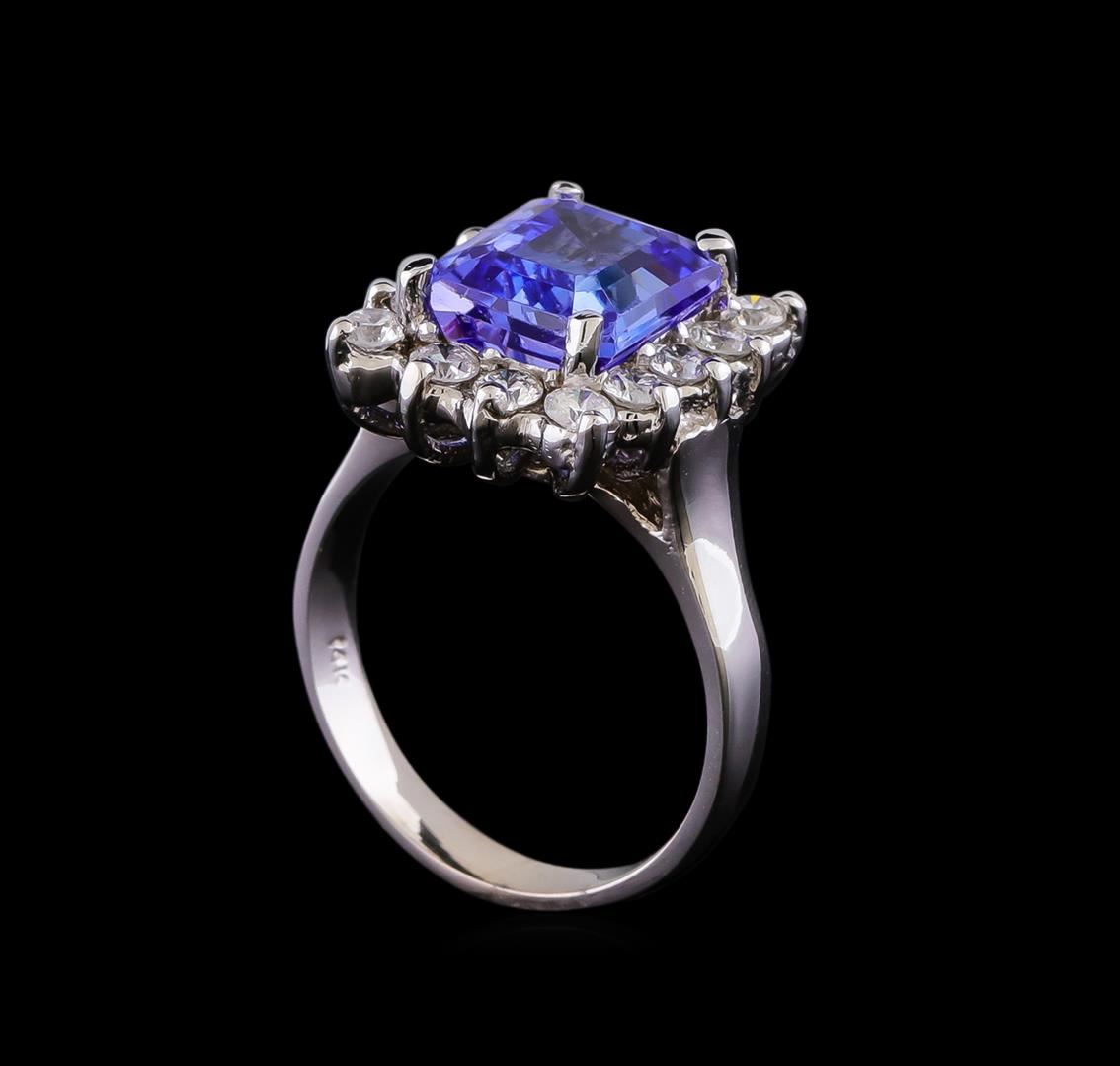 One electronically tested 14KT white gold lady's cast fashion ring with a basket halo with a bright polish finish. The featured lady's has a shank measuring 2.85 millimeters in width. Identified with markings of "14K". Condition is new, good workmanship. Containing: One prong set emerald step cut natural tanzanite, measuring 9.27 x 8.08 x 5.57mm, (depth est.) 12%. bulge factor, approximate weight of 4.24ct., clarity is eye clean, medium light, moderately strong, violetish blue color, (GIA vB 4/4), cut is very good. Transmitting light with no distortion, transparent. Colored gemstones are presumed to have been subjected to commonly used enhancement processes. Graded in the setting. Fourteen prong set round brilliant cut diamonds, measuring 2.60 - 2.55 x 1.61mm (depth est.) approximate total weight of 14 Stones = 0.92ct. Graded in the setting. Clarity: SI-1 to SI-2. Color: H - I. Cut Good. Total Weight of Colored Stones 4.24ct. Total Weight of Diamonds 0.92ct. Total Weight of Ring 6.60gm. GAS Appraised.