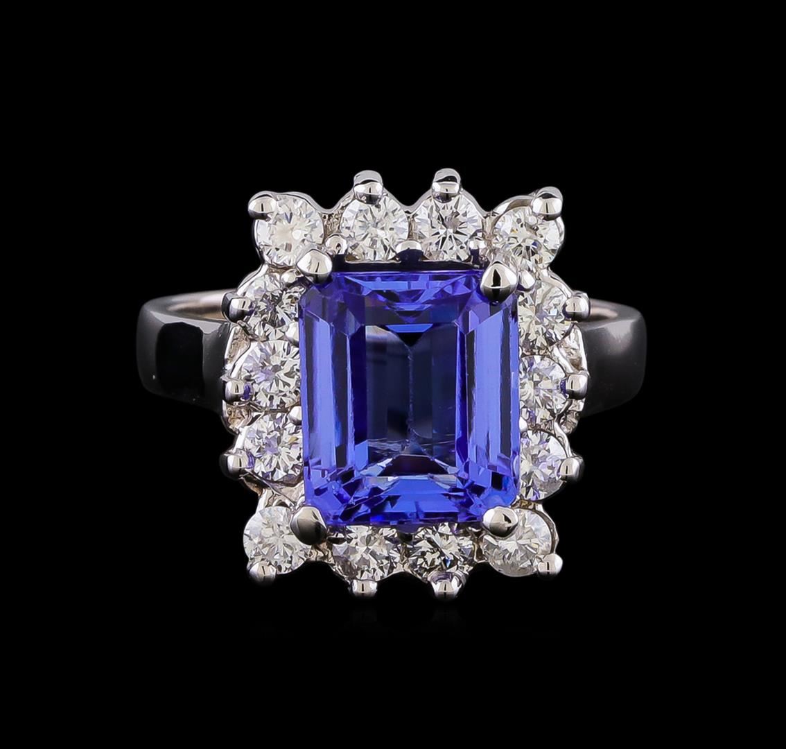 One electronically tested 14KT white gold lady's cast fashion ring with a basket halo with a bright polish finish. The featured lady's has a shank measuring 2.85 millimeters in width. Identified with markings of "14K". Condition is new, good workmanship. Containing: One prong set emerald step cut natural tanzanite, measuring 9.27 x 8.08 x 5.57mm, (depth est.) 12%. bulge factor, approximate weight of 4.24ct., clarity is eye clean, medium light, moderately strong, violetish blue color, (GIA vB 4/4), cut is very good. Transmitting light with no distortion, transparent. Colored gemstones are presumed to have been subjected to commonly used enhancement processes. Graded in the setting. Fourteen prong set round brilliant cut diamonds, measuring 2.60 - 2.55 x 1.61mm (depth est.) approximate total weight of 14 Stones = 0.92ct. Graded in the setting. Clarity: SI-1 to SI-2. Color: H - I. Cut Good. Total Weight of Colored Stones 4.24ct. Total Weight of Diamonds 0.92ct. Total Weight of Ring 6.60gm. GAS Appraised.