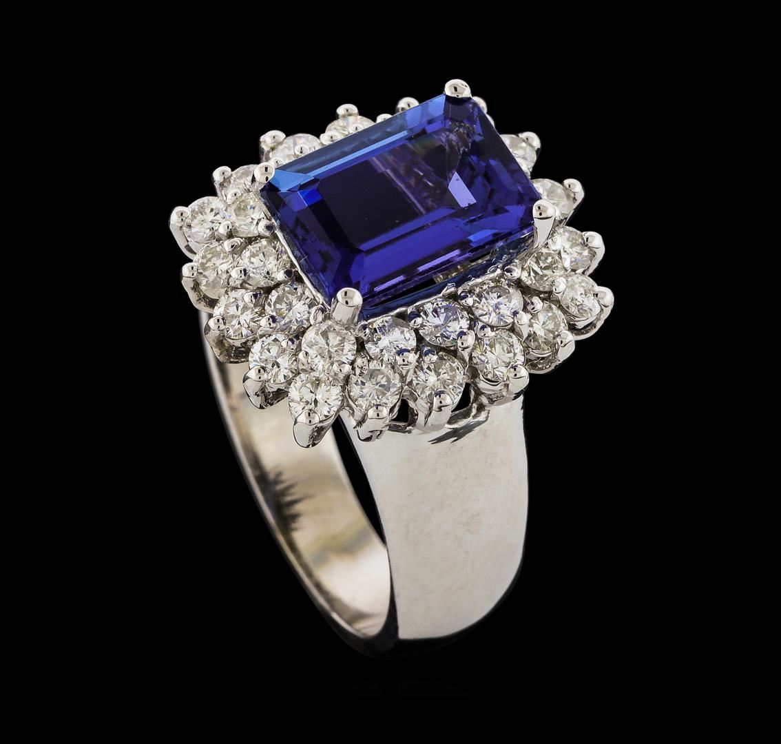 One electronically tested 14KT white gold lady's cast fashion ring with a double basket halo with a bright polish finish. The featured lady's ring has a shank measuring 4.31 millimeters wide. Identified with markings of '14K'. Condition is new, good workmanship. Containing: One prong set emerald standard step cut natural tanzanite, measuring 10.81 x 7.83 x 5.38mm, (depth est.) approximate weight of 4.24ct., clarity is eye clean, medium dark, moderately strong, violetish blue color, (GIA vB 6/4), cut is very good. Transmitting light with no distortion, transparent. Colored gemstones are presumed to have been subjected to commonly used enhancement processes. Graded in the setting. Thirty-Two prong set round brilliant cut diamonds, measuring 2.40 - 2.35 x 1.48mm (depth est.) approximate total weight of 32 Stones = 1.63ct. Graded in the setting. Clarity SI-1 to SI-3. Color: H - I Cut Good. Total Weight of Colored Stones 4.24ct.. Total Weight of Diamonds 1.63ct.. Total Weight of Ring 9.80gm. GAS Appraised at $10,840.00.