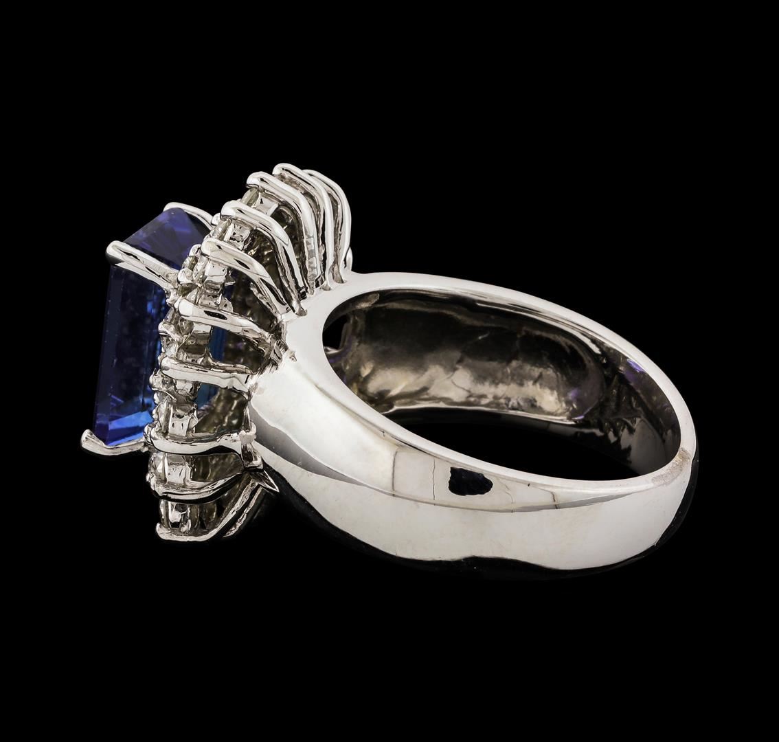 One electronically tested 14KT white gold lady's cast fashion ring with a double basket halo with a bright polish finish. The featured lady's ring has a shank measuring 4.31 millimeters wide. Identified with markings of '14K'. Condition is new, good workmanship. Containing: One prong set emerald standard step cut natural tanzanite, measuring 10.81 x 7.83 x 5.38mm, (depth est.) approximate weight of 4.24ct., clarity is eye clean, medium dark, moderately strong, violetish blue color, (GIA vB 6/4), cut is very good. Transmitting light with no distortion, transparent. Colored gemstones are presumed to have been subjected to commonly used enhancement processes. Graded in the setting. Thirty-Two prong set round brilliant cut diamonds, measuring 2.40 - 2.35 x 1.48mm (depth est.) approximate total weight of 32 Stones = 1.63ct. Graded in the setting. Clarity SI-1 to SI-3. Color: H - I Cut Good. Total Weight of Colored Stones 4.24ct.. Total Weight of Diamonds 1.63ct.. Total Weight of Ring 9.80gm. GAS Appraised at $10,840.00.
