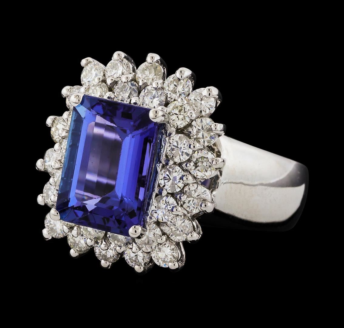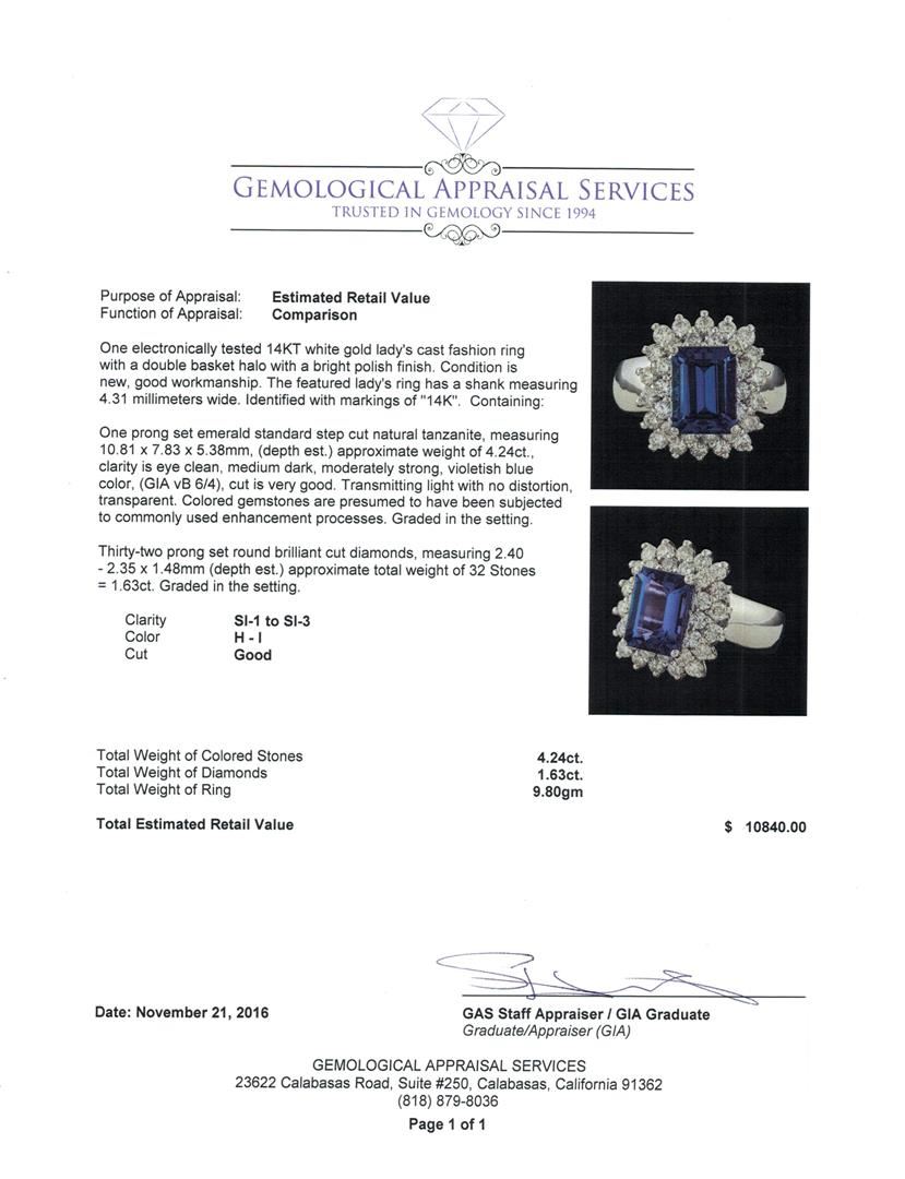 One electronically tested 14KT white gold lady's cast fashion ring with a double basket halo with a bright polish finish. The featured lady's ring has a shank measuring 4.31 millimeters wide. Identified with markings of '14K'. Condition is new, good workmanship. Containing: One prong set emerald standard step cut natural tanzanite, measuring 10.81 x 7.83 x 5.38mm, (depth est.) approximate weight of 4.24ct., clarity is eye clean, medium dark, moderately strong, violetish blue color, (GIA vB 6/4), cut is very good. Transmitting light with no distortion, transparent. Colored gemstones are presumed to have been subjected to commonly used enhancement processes. Graded in the setting. Thirty-Two prong set round brilliant cut diamonds, measuring 2.40 - 2.35 x 1.48mm (depth est.) approximate total weight of 32 Stones = 1.63ct. Graded in the setting. Clarity SI-1 to SI-3. Color: H - I Cut Good. Total Weight of Colored Stones 4.24ct.. Total Weight of Diamonds 1.63ct.. Total Weight of Ring 9.80gm. GAS Appraised at $10,840.00.