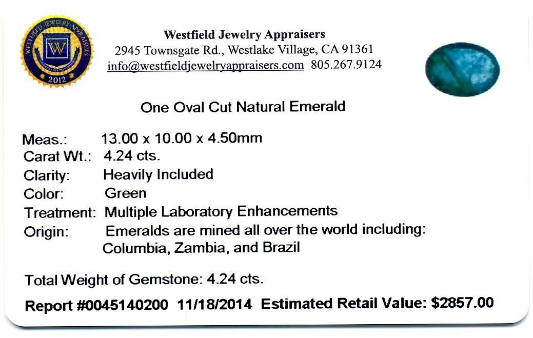 4.24ct. One Oval Cut Natural Emerald Westfield Appraised at $2,857.00.