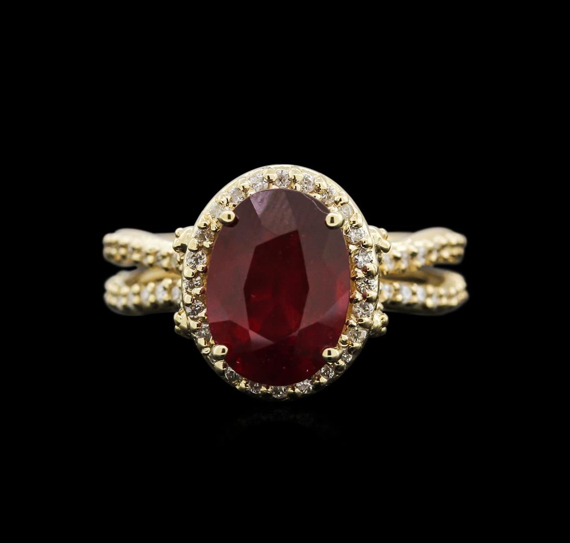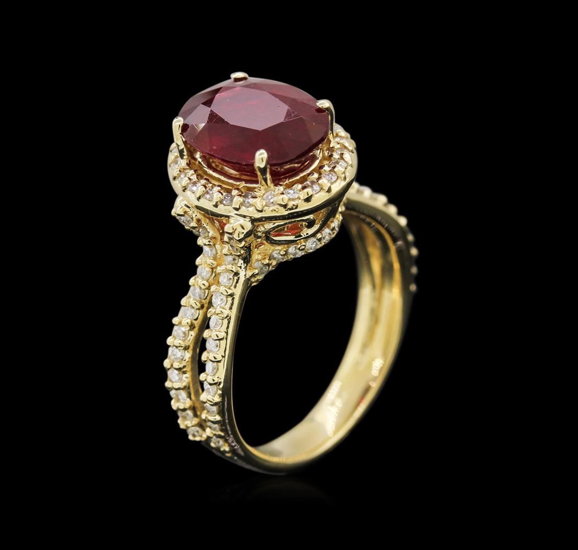 One electronically tested 14KT yellow gold lady's cast fashion ring with a split shank with a bright polish finish. The featured lady's ring has a shank measuring 3.56 millimeters wide. Identified with markings of "K14". Condition is new, good workmanship. Containing: One prong set oval modified brilliant cut natural ruby, measuring 11.22 x 8.16 x 5.40mm, approximate weight of 4.24ct., clarity is heavily included, type II, medium dark, very slightly brownish, orangy red color, (GIA oR 6/3), cut is good. Transmitting light somewhat diffusely, semi-transparent to translucent. Naturally occurring internal & external characteristics are present. Indications of laboratory high temperature heat treatment, with glass & flux additives. Graded in the setting. Ninety prong set round brilliant cut diamonds, measuring 1.30 - 1.20 x 0.75mm (depth est.) approximate total weight of 90 Stones = 0.62ct. Graded in the setting. Clarity: SI-2 to I-1. Color: H - I. Cut Good. Total Weight of Colored Stones 4.24ct. Total Weight of Diamonds 0.62ct. Total Weight of Ring 7.10gm. GAS Appraised at $4,505.00.