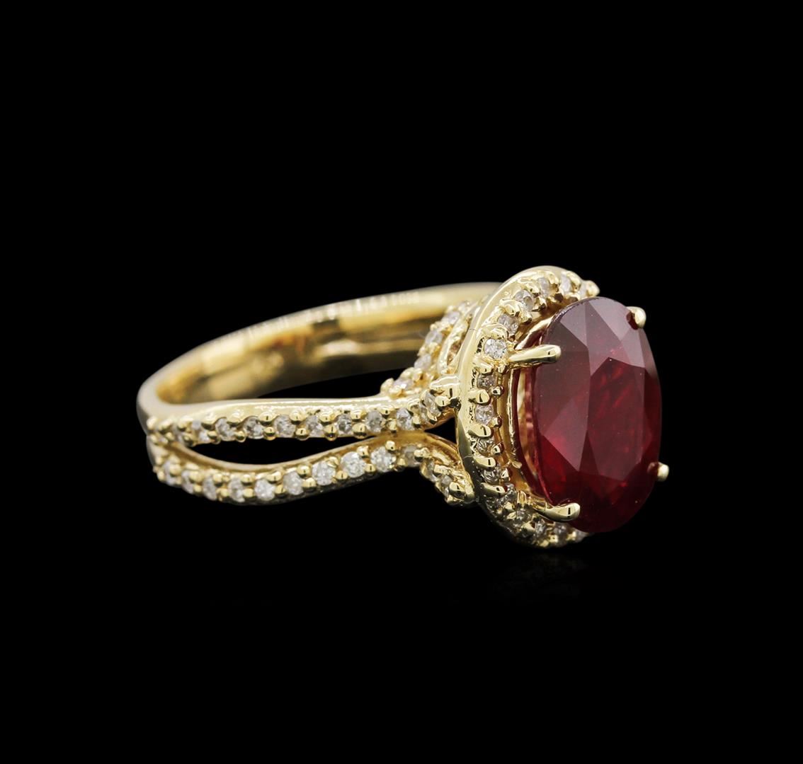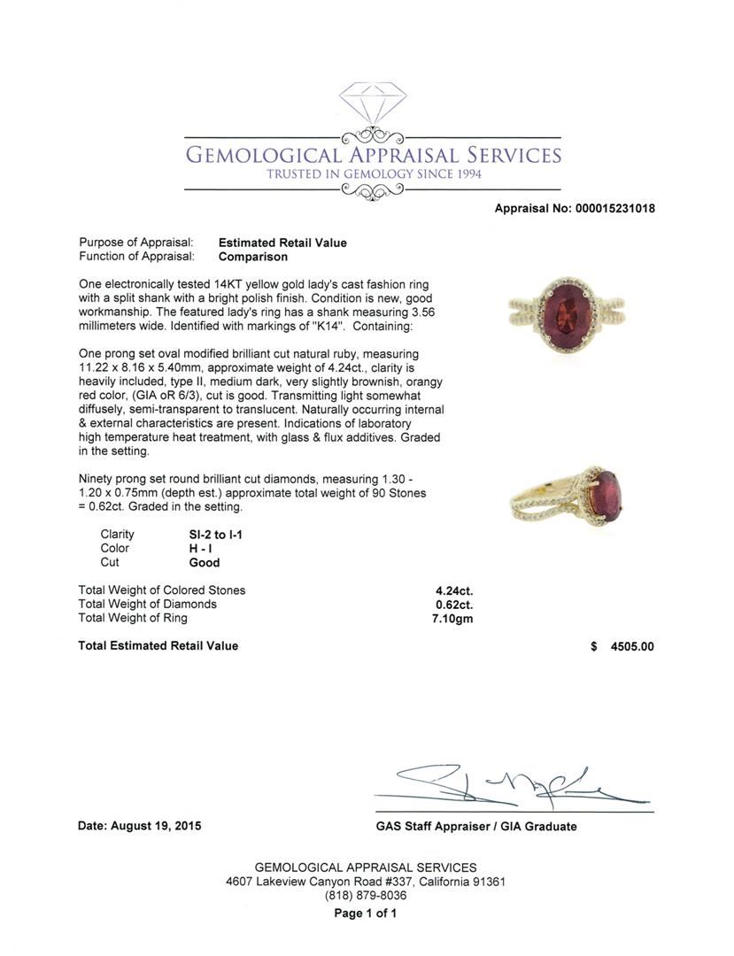 One electronically tested 14KT yellow gold lady's cast fashion ring with a split shank with a bright polish finish. The featured lady's ring has a shank measuring 3.56 millimeters wide. Identified with markings of "K14". Condition is new, good workmanship. Containing: One prong set oval modified brilliant cut natural ruby, measuring 11.22 x 8.16 x 5.40mm, approximate weight of 4.24ct., clarity is heavily included, type II, medium dark, very slightly brownish, orangy red color, (GIA oR 6/3), cut is good. Transmitting light somewhat diffusely, semi-transparent to translucent. Naturally occurring internal & external characteristics are present. Indications of laboratory high temperature heat treatment, with glass & flux additives. Graded in the setting. Ninety prong set round brilliant cut diamonds, measuring 1.30 - 1.20 x 0.75mm (depth est.) approximate total weight of 90 Stones = 0.62ct. Graded in the setting. Clarity: SI-2 to I-1. Color: H - I. Cut Good. Total Weight of Colored Stones 4.24ct. Total Weight of Diamonds 0.62ct. Total Weight of Ring 7.10gm. GAS Appraised at $4,505.00.