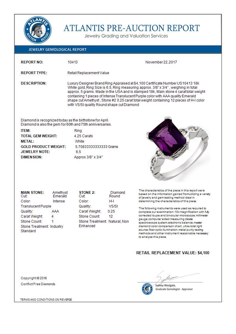 10413 - REF-57A3V ---- 4.25 CTW Amethyst & Diamond Ring 18K White Gold ---- Luxury Designer Brand Ring Appraised at $4,100 Certificate Number US10413 18k White gold, Ring Size is 6.5, Ring measuring approx. 3/8" x 3/4" , weighing in total approx. 5 grams. Made in the USA and is stamped 18k, Main stone 4 carat total weight containing 1 pieces of Intense Translucent Purple color with AAA quality Emerald shape cut Amethyst , Stone #2 0.25 carat total weight containing 12 pieces of H-I color with VS/SI quality Round shape cut Diamond