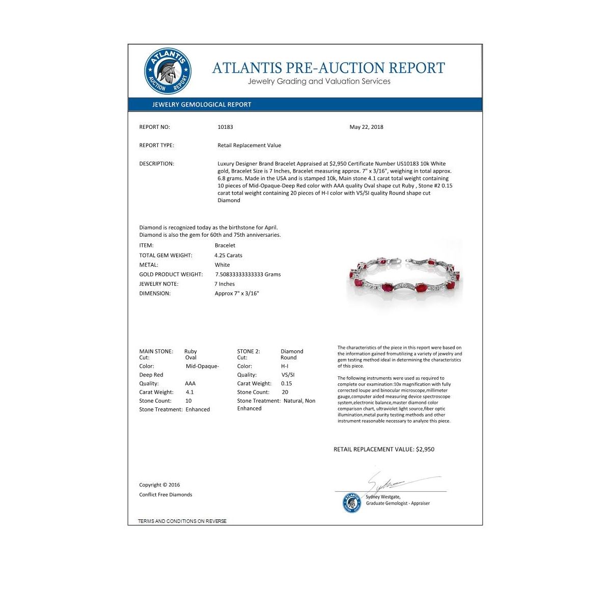 REF-44T5M -10183 ---- 4.25 CTW Ruby & Diamond Bracelet 10K White Gold ---- Luxury Designer Brand Bracelet Appraised at $2,950 Certificate Number US10183 10k White gold, Bracelet Size is 7 Inches, Bracelet measuring approx. 7" x 3/16", weighing in total approx. 6.8 grams. Made in the USA and is stamped 10k, Main stone 4.1 carat total weight containing 10 pieces of Mid-Opaque-Deep Red color with AAA quality Oval shape cut Ruby , Stone #2 0.15 carat total weight containing 20 pieces of H-I color with VS/SI quality Round shape cut Diamond