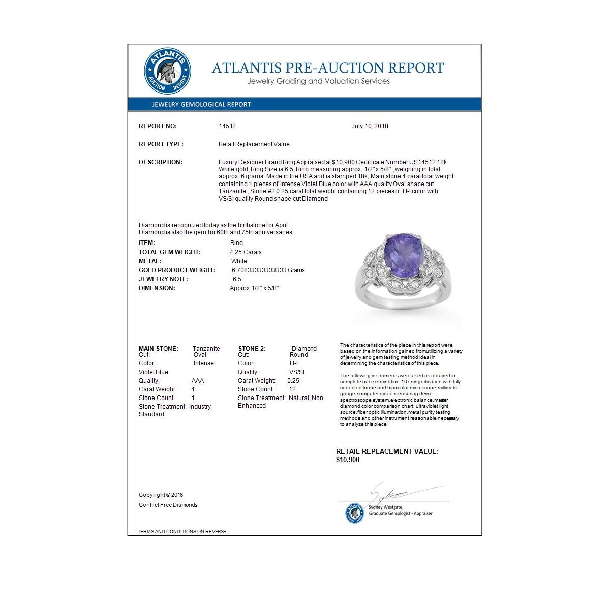REF-141M8H -14512 ---- 4.25 CTW Tanzanite & Diamond Ring 18K White Gold ---- Luxury Designer Brand Ring Appraised at $10,900 Certificate Number US14512 18k White gold, Ring Size is 6.5, Ring measuring approx. 1/2" x 5/8" , weighing in total approx. 6 grams. Made in the USA and is stamped 18k, Main stone 4 carat total weight containing 1 pieces of Intense Violet Blue color with AAA quality Oval shape cut Tanzanite , Stone #2 0.25 carat total weight containing 12 pieces of H-I color with VS/SI quality Round shape cut Diamond