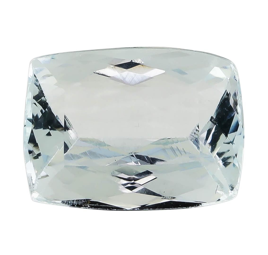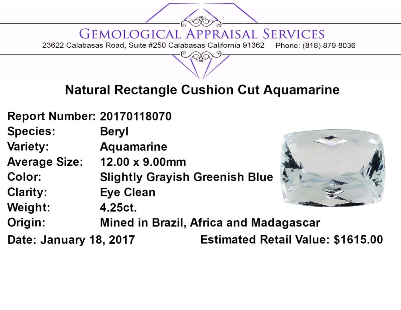 One natural rectangle cushion cut aquamarine with an exact weight of 4.25ct., clarity is eye clean, slightly grayish greenish blue. Gemological Appraisals Services estimates the retail value at $1615 GAS Appraised.