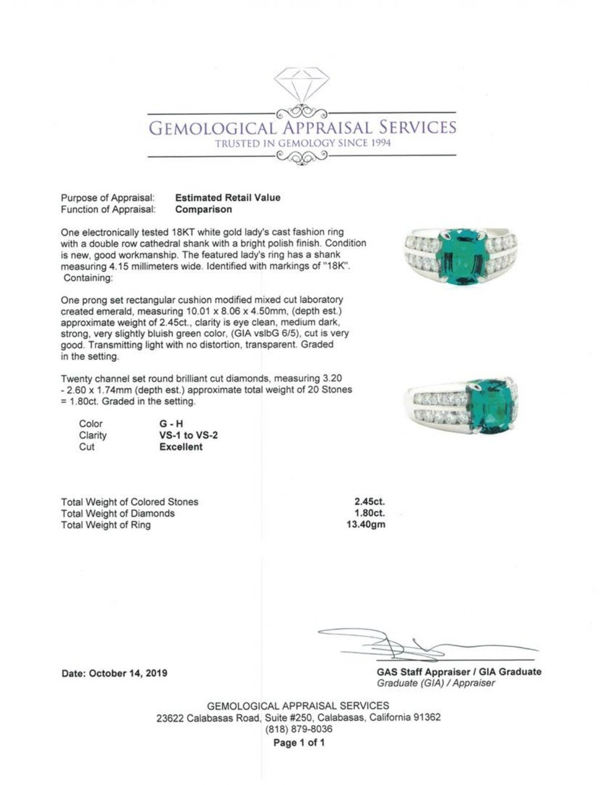 One electronically tested 18KT white gold lady's cast fashion ring with a double row cathedral shank with a bright polish finish. The featured lady's ring has a shank measuring 4.15 millimeters wide. Identified with markings of '18K'. Condition is new, good workmanship. Containing: One prong set rectangular cushion modified mixed cut laboratory created emerald, measuring 10.01 x 8.06 x 4.50mm, (depth est.) approximate weight of 2.45ct., clarity is eye clean, medium dark, strong, very slightly bluish green color, (GIA vslbG 6/5), cut is very good. Transmitting light with no distortion, transparent. Graded in the setting. Twenty channel set round brilliant cut diamonds, measuring 3.20 - 2.60 x 1.74mm (depth est.) approximate total weight of 20 Stones = 1.80ct. Graded in the setting. Color G - H Clarity VS-1 to VS-2 Cut Excellent. Total Weight of Colored Stones 2.45ct.. Total Weight of Diamonds 1.80ct.. Total Weight of Ring 13.40gm GAS Appraised at $9250.00. GAS Appraised at $9,250.00.