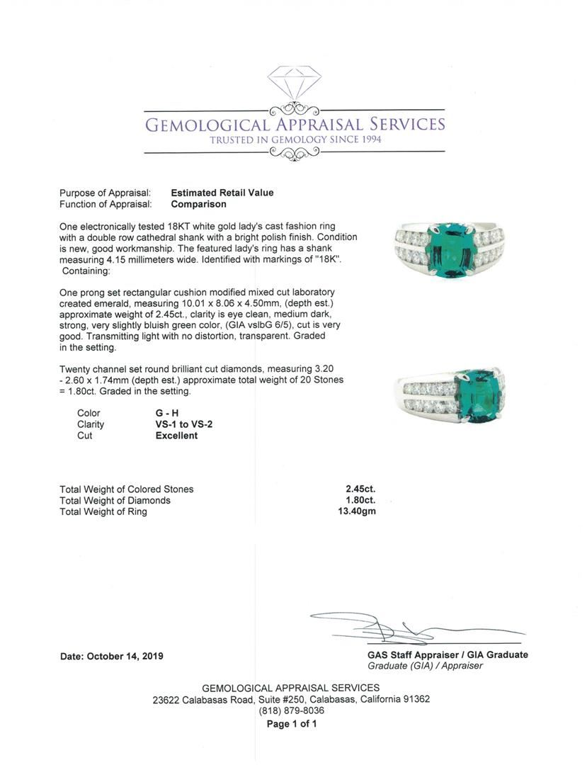 One electronically tested 18KT white gold lady's cast fashion ring with a double row cathedral shank with a bright polish finish. The featured lady's ring has a shank measuring 4.15 millimeters wide. Identified with markings of '18K'. Condition is new, good workmanship. Containing: One prong set rectangular cushion modified mixed cut laboratory created emerald, measuring 10.01 x 8.06 x 4.50mm, (depth est.) approximate weight of 2.45ct., clarity is eye clean, medium dark, strong, very slightly bluish green color, (GIA vslbG 6/5), cut is very good. Transmitting light with no distortion, transparent. Graded in the setting. Twenty channel set round brilliant cut diamonds, measuring 3.20 - 2.60 x 1.74mm (depth est.) approximate total weight of 20 Stones = 1.80ct. Graded in the setting. Color G - H Clarity VS-1 to VS-2 Cut Excellent. Total Weight of Colored Stones 2.45ct.. Total Weight of Diamonds 1.80ct.. Total Weight of Ring 13.40gm GAS Appraised at $9250.00. GAS Appraised.