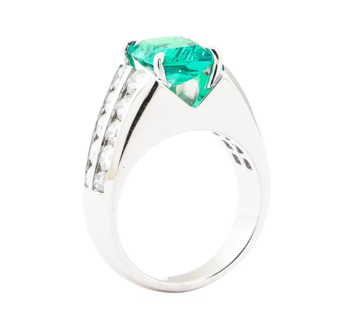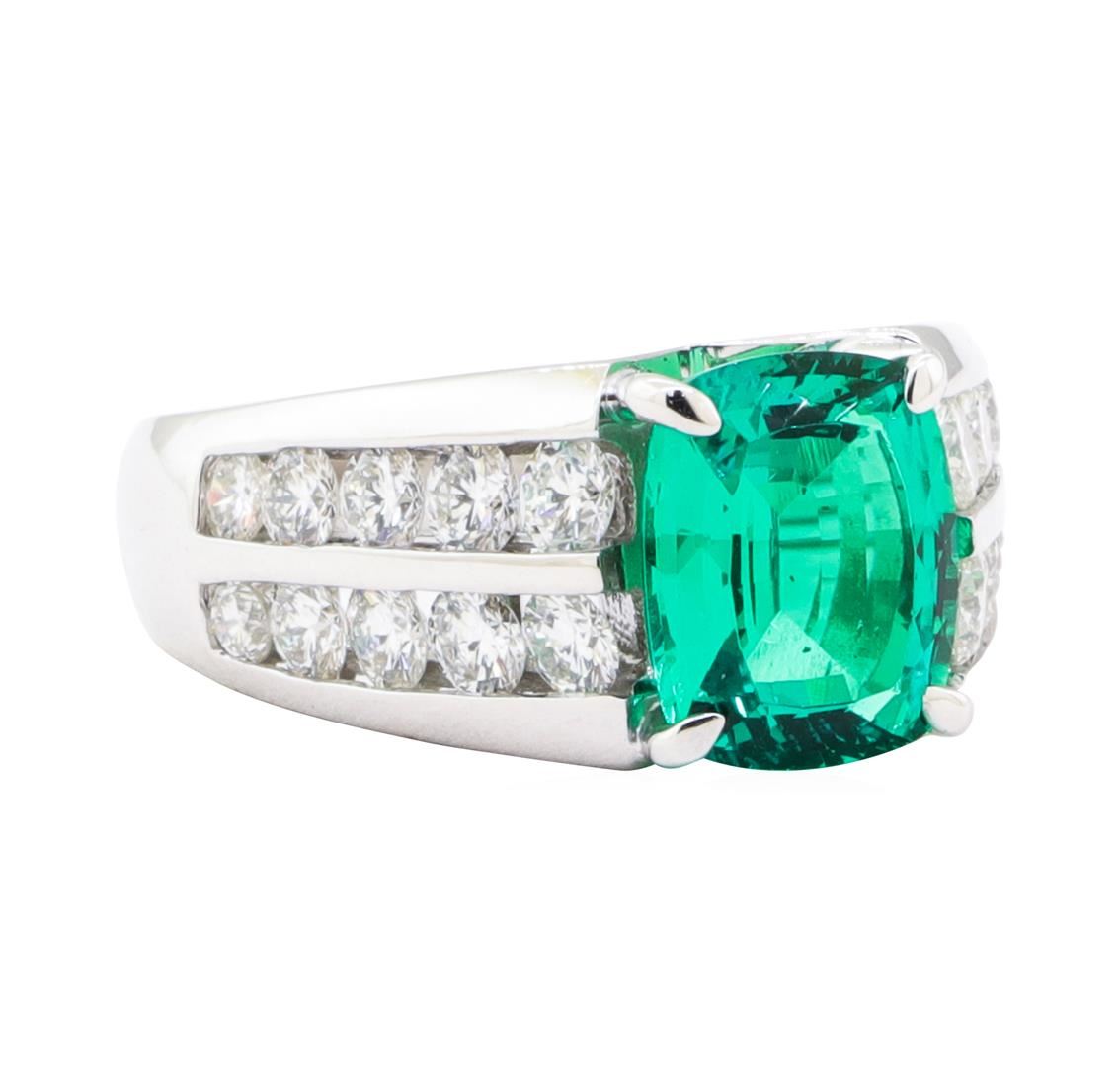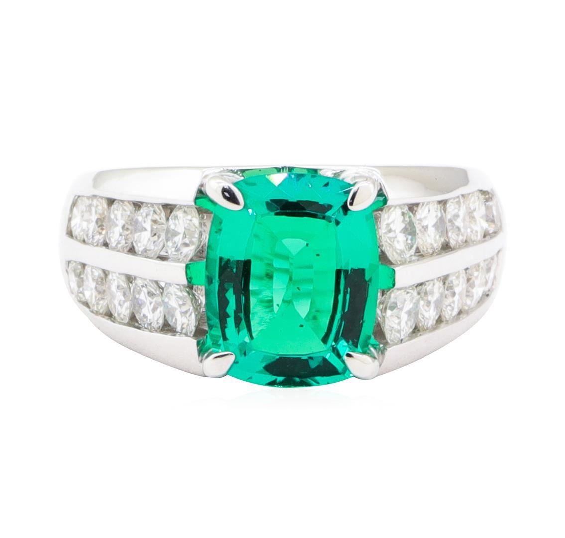One electronically tested 18KT white gold lady's cast fashion ring with a double row cathedral shank with a bright polish finish. The featured lady's ring has a shank measuring 4.15 millimeters wide. Identified with markings of '18K'. Condition is new, good workmanship. Containing: One prong set rectangular cushion modified mixed cut laboratory created emerald, measuring 10.01 x 8.06 x 4.50mm, (depth est.) approximate weight of 2.45ct., clarity is eye clean, medium dark, strong, very slightly bluish green color, (GIA vslbG 6/5), cut is very good. Transmitting light with no distortion, transparent. Graded in the setting. Twenty channel set round brilliant cut diamonds, measuring 3.20 - 2.60 x 1.74mm (depth est.) approximate total weight of 20 Stones = 1.80 ct. Graded in the setting. Color G - H Clarity VS-1 to VS-2 Cut Excellent. Total Weight of Colored Stones 2.45ct.. Total Weight of Diamonds 1.80 ct.. Total Weight of Ring 13.40gm GAS Appraised at $9250.00. GAS Appraised.