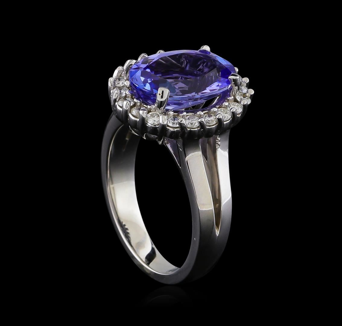 One electronically tested 14KT white gold lady's cast fashion ring with a basket halo with a bright polish finish. The featured lady's ring has a shank measuring 3.17 millimeters wide. Identified with markings of "14K". Condition is new, good workmanship. Containing: One prong set oval modified brilliant cut natural tanzanite, measuring 12.38 x 8.92 x 5.44mm, approximate weight of 4.25ct., clarity is eye clean, type I, medium light, moderately strong, violetish blue color, (GIA vB 4/4), cut is good. Transmitting light with no distortion, transparent. Colored gemstones are presumed to have been subjected to commonly used enhancement processes. Graded in the setting. Twenty prong set round brilliant cut diamonds, measuring 1.90 - 1.85 x 1.17mm (depth est.) approximate total weight of 20 Stones = 0.50ct. Graded in the setting. Clarity: SI-1 to SI-2. Color: G - Good. Total Weight of Colored Stones 4.25ct. Total Weight of Diamonds 0.50ct. Total Weight of Ring 9.30gm. GAS Appraised at $7,645.00.