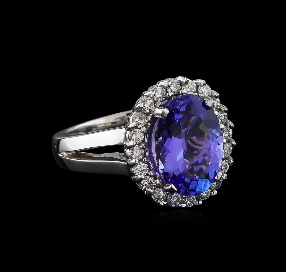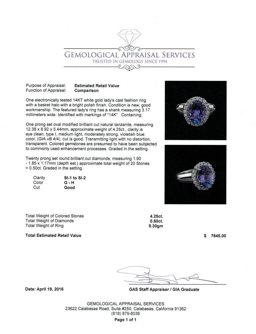 One electronically tested 14KT white gold lady's cast fashion ring with a basket halo with a bright polish finish. The featured lady's ring has a shank measuring 3.17 millimeters wide. Identified with markings of "14K". Condition is new, good workmanship. Containing: One prong set oval modified brilliant cut natural tanzanite, measuring 12.38 x 8.92 x 5.44mm, approximate weight of 4.25ct., clarity is eye clean, type I, medium light, moderately strong, violetish blue color, (GIA vB 4/4), cut is good. Transmitting light with no distortion, transparent. Colored gemstones are presumed to have been subjected to commonly used enhancement processes. Graded in the setting. Twenty prong set round brilliant cut diamonds, measuring 1.90 - 1.85 x 1.17mm (depth est.) approximate total weight of 20 Stones = 0.50ct. Graded in the setting. Clarity: SI-1 to SI-2. Color: G - Good. Total Weight of Colored Stones 4.25ct. Total Weight of Diamonds 0.50ct. Total Weight of Ring 9.30gm. GAS Appraised at $7,645.00.