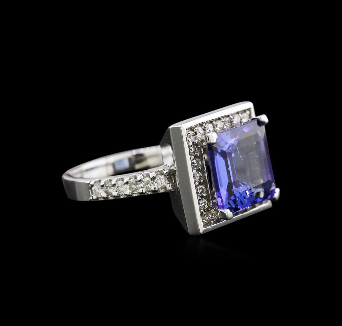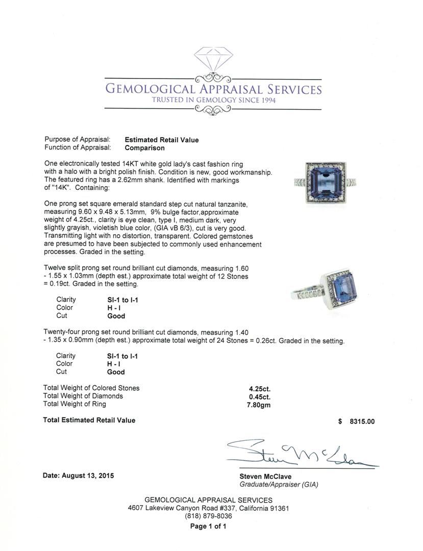 One electronically tested 14KT white gold lady's cast fashion ring with a halo with a bright polish finish. The featured ring has a 2.62mm shank. Identified with markings of "14K". Condition is new, good workmanship. Containing: One prong set square emerald standard step cut natural tanzanite, measuring 9.60 x 9.48 x 5.13mm, 9% bulge factor, approximate weight of 4.25ct., clarity is eye clean, type I, medium dark, very slightly grayish, violetish blue color, (GIA vB 6/3), cut is very good. Transmitting light with no distortion, transparent. Colored gemstones are presumed to have been subjected to commonly used enhancement processes. Graded in the setting. Twelve split prong set round brilliant cut diamonds, measuring 1.60 - 1.55 x 1.03mm (depth est.) approximate total weight of 12 Stones = 0.19ct. Graded in the setting. Clarity: SI-1 to I-1. Color: H - I. Cut Good Twenty-Four prong set round brilliant cut diamonds, measuring 1.40 - 1.35 x 0.90mm (depth est.) approximate total weight of 24 Stones = 0.26ct. Graded in the setting. Clarity: SI-1 to I-1. Color: H - I. Cut Good. Total Weight of Colored Stones 4.25ct. Total Weight of Diamonds 0.45ct. Total Weight of Ring 7.80gm. GAS Appraised at $8,315.00.