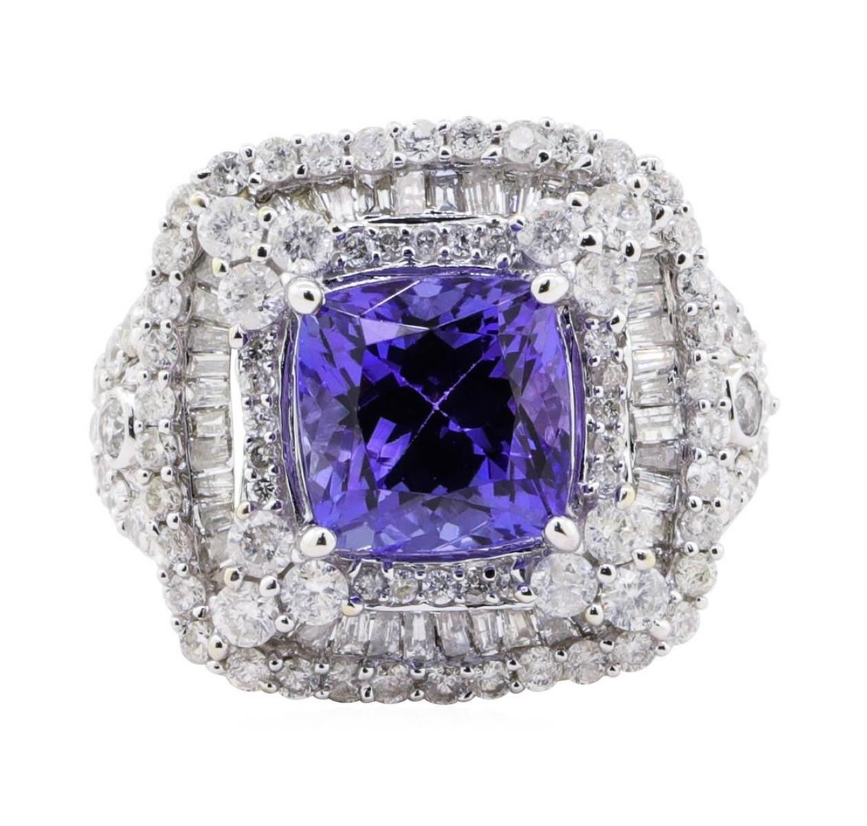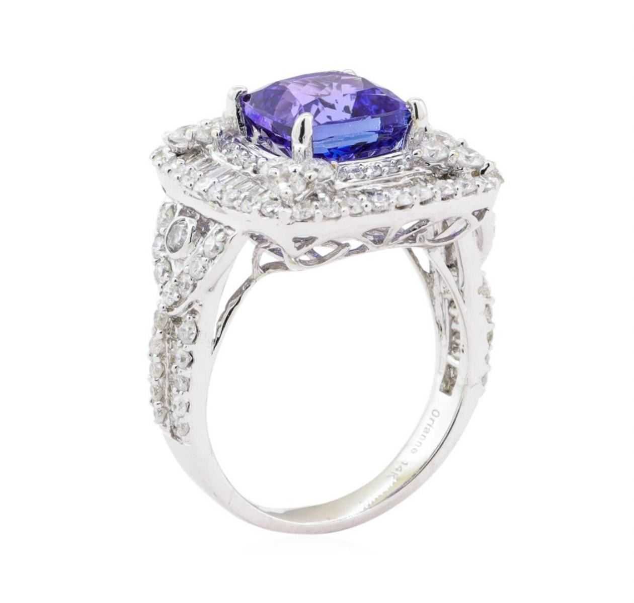 One electronically tested 14KT white gold ladies cast tanzanite & diamond ring. The featured tanzanite is set within a three tiered diamond bezel, supported by an elaborate lattice under gallery and diamond set shoulders, completed by a two and one half millimeter wide band. Bright polish finish. Trademark is Orianne. Identified with markings of "14K". Condition is new, good workmanship. Containing: One prong set square cushion cut natural tanzanite, measuring 8.75 x 8.60 x 7.00mm, approximate weight of 4.25ct., clarity is eye clean, type I, medium dark, moderately strong, violet color, (GIA V 6/4), cut is good. Transmitting light with a minimum of distortion, transparent. Naturally occurring internal & external characteristics are present. Graded in the setting. Tanzanite is a very rare gemstone that is only found in the country of Tanzania. Originally discovered in 1967. Tiffany & Company, named the stone Tanzanite. It is found in the Usumburu Mountains that border the Umba Valley of northern Tanzania. Tanzanite occurs in gray, brown, violet, blue, reddish-purple, & green. The gem is interesting because of its exceptional pleochroism. Rotated in different directions a tanzanite will exhibit multiple changes of color. Tanzanite has a low tolerance to ultrasonic cleaning, and should not be cleaned using this method. One Hundred Forty-Six prong & bezel set round & baguette cut diamonds approximate total weight of 146 Stones = 2.38ct. Graded in the setting. Clarity I-1 to I-2 Color F - H Total Weight of Colored Stones 4.25 ct. Total Weight of Diamonds 2.38 ct. Total Weight of Ring 8.70 gm Estimated Retail Value $ 17,250.00 US