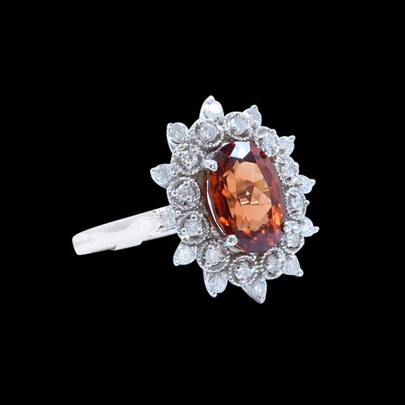 14K White GOLD NATURAL MALAYA GARNET RING:5.28GRAM /MALAYA GARNET: 4.25CT/DIAMOND :0.59CT/#GVR1264/MALAYA GARNET IS THE VERY RARE GARNET IN THE GARNET FAMILY. VERY HARD TO FIND THIS KIND OF COLOR AND QULAITY
