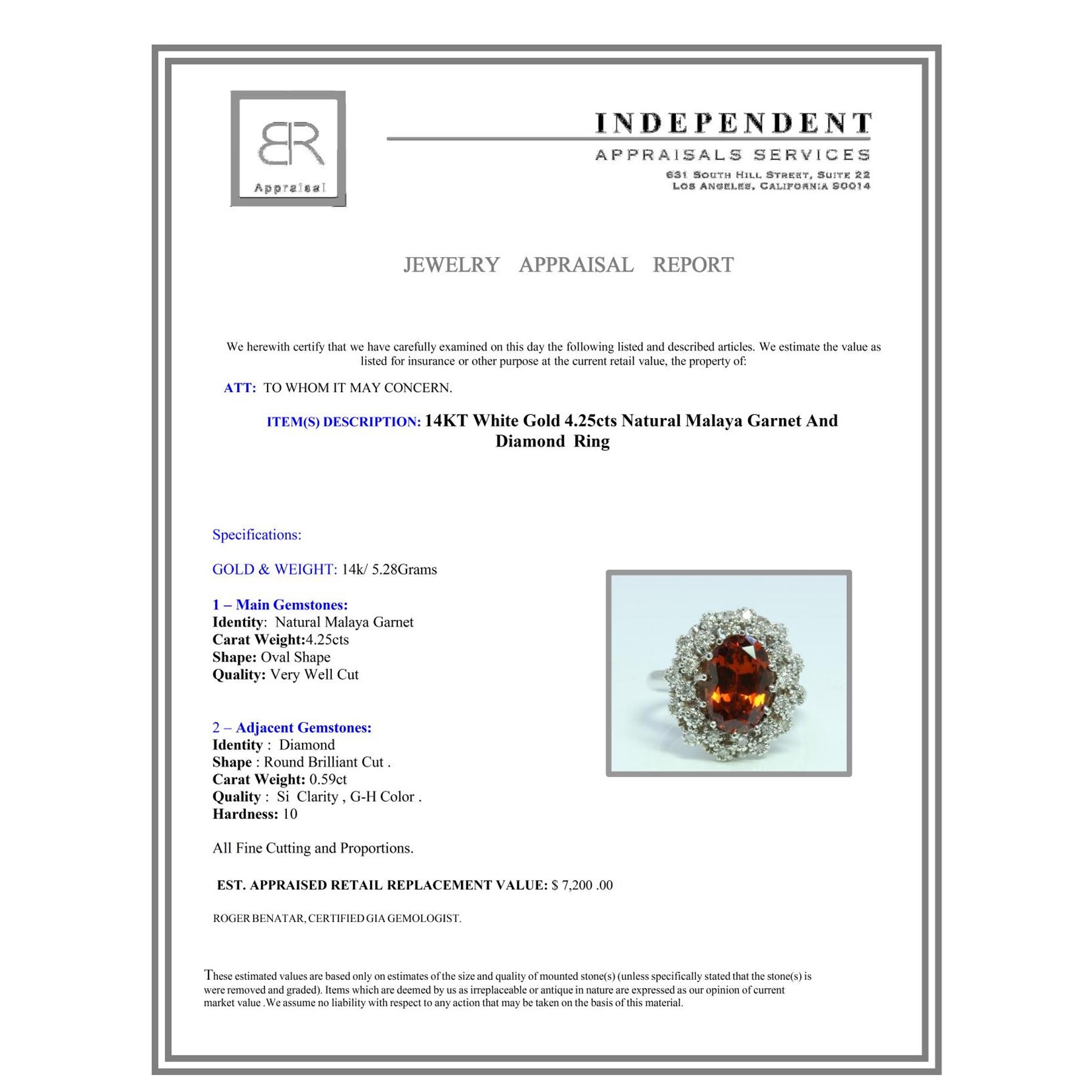 14K White GOLD NATURAL MALAYA GARNET RING:5.28GRAM /MALAYA GARNET: 4.25CT/DIAMOND :0.59CT/#GVR1264/MALAYA GARNET IS THE VERY RARE GARNET IN THE GARNET FAMILY. VERY HARD TO FIND THIS KIND OF COLOR AND QULAITY ***This vibrant 4.25ct oval shape Natural Malaya Garnet ravishes the eye with its bold brilliance. Garnet reflects the light of the heart and helps one receive abundance on an emotional level. Warmly crafted in 14k white gold and enveloped by dazzling wreath of 0.59ct Round Brilliant Cut Diamonds, this cocktail ring is a secure purchase; it beckons gazes of adoration.**