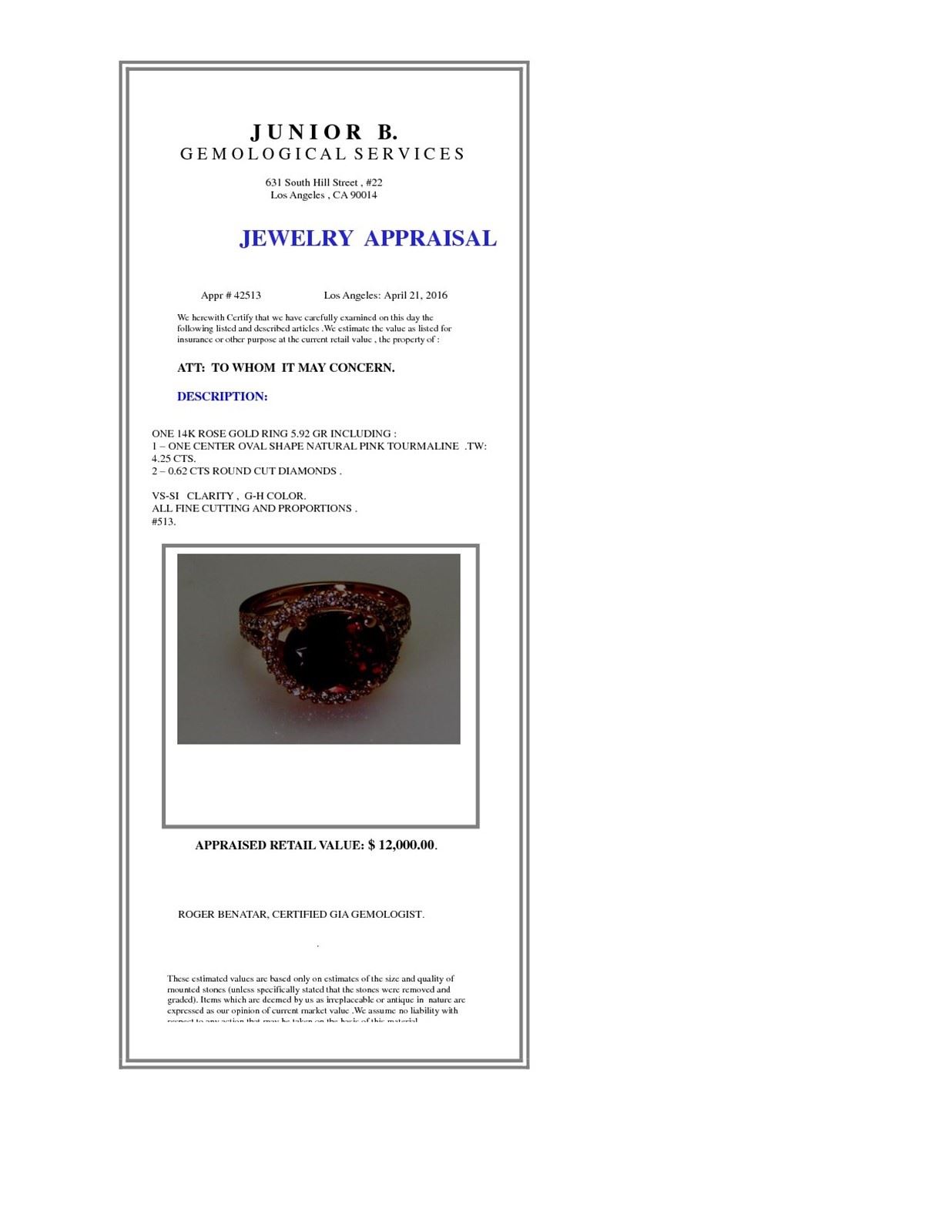 14K ROSE GOLD NATURAL TOURMALINE RING:5.92 GRAMS/PINK TOURMALINE :4.25CT/ DIAMOND :0.62CT/#GVR1221 **Warmly crafted in 14k rose gold, this 4.25ct oval cut Pink Tourmaline softly sings lullabies of its delicate beauty. Known as the quintessential heart chakra stone, its brilliant hue is brightened by a glittering 0.62ct round cut Diamond accent surround, and the stepped detailing on the shank adds textural appeal. this cocktail ring is a secure purchase.**