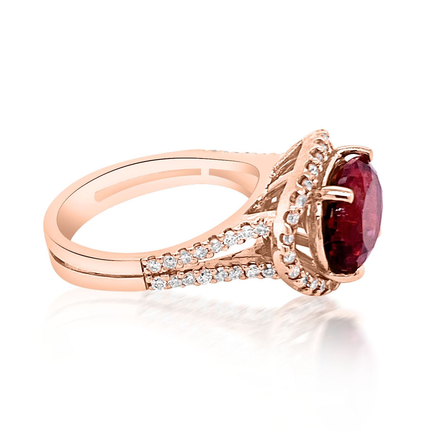 14K ROSE GOLD NATURAL TOURMALINE RING:5.92 GRAMS/PINK TOURMALINE :4.25CT/ DIAMOND :0.62CT/#GVR1221 **Warmly crafted in 14k rose gold, this 4.25ct oval cut Pink Tourmaline softly sings lullabies of its delicate beauty. Known as the quintessential heart chakra stone, its brilliant hue is brightened by a glittering 0.62ct round cut Diamond accent surround, and the stepped detailing on the shank adds textural appeal. this cocktail ring is a secure purchase.**