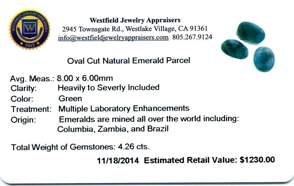 4.26cts. Oval Cut Natural Emerald Parcel Westfield Appraised at $1,230.00.
