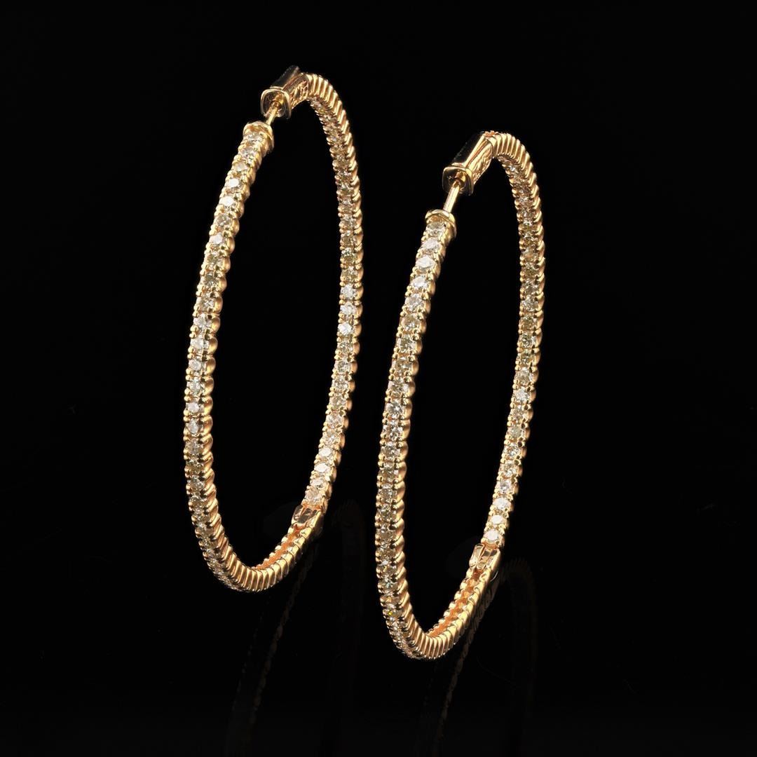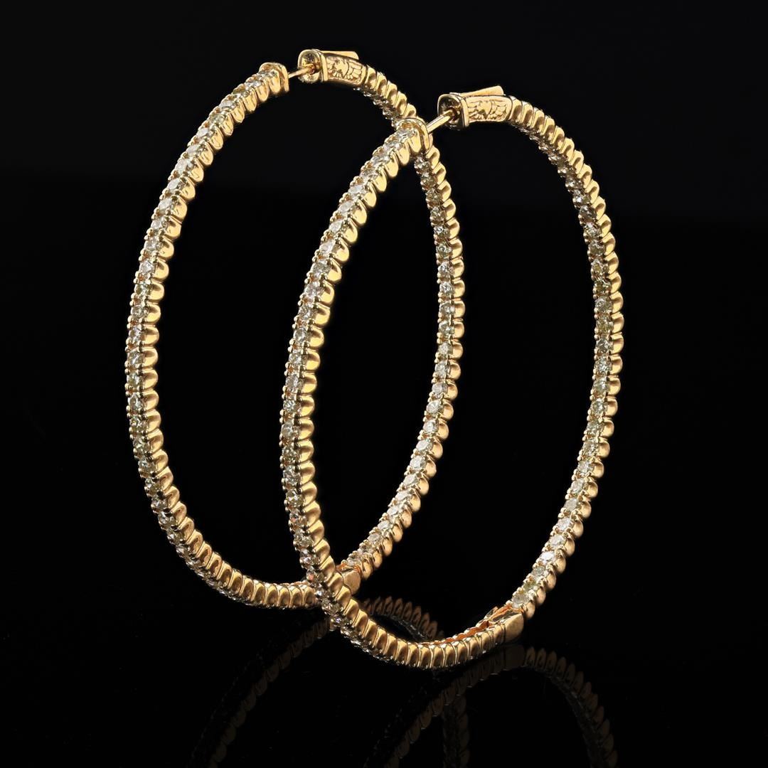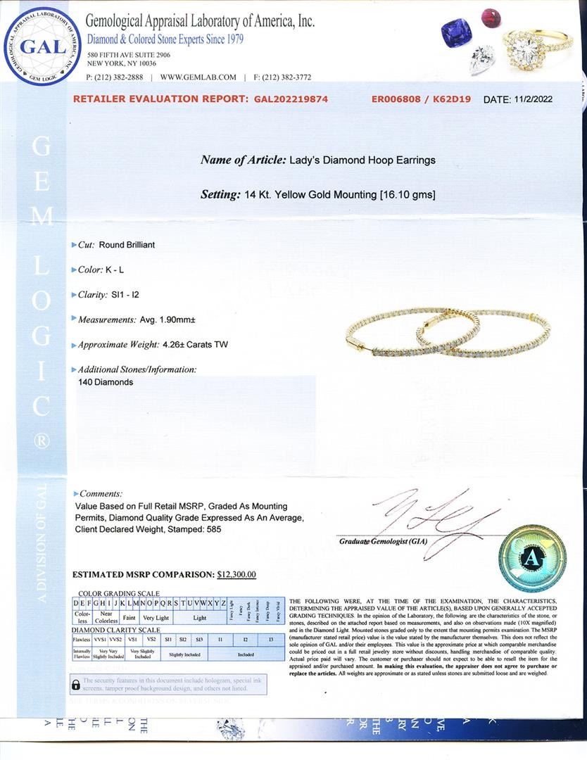 4.26ctw Diamond 14K Yellow Gold Hoop Earrings. Name of Article: Lady's Diamond Hoop Earrings Setting: 14 Kt. Yellow Gold Mounting [16.10 gms] Cut: Round Brilliant Color: K - L Clarity: SI1 - I2 Measurements: Avg. 1.90mm Approximate Weight: 4.261 Carats TW Additional Stones/Information: 140 Diamonds