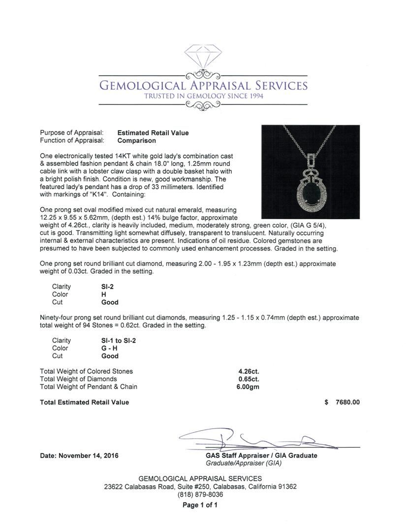 One electronically tested 14KT white gold lady's combination cast & assembled fashion pendant & chain 18.0' long, 1.25mm round cable link with a lobster claw clasp with a double basket halo with a bright polish finish. The featured lady's pendant has a drop of 33 millimeters. Identified with markings of 'K14'. Condition is new, good workmanship. Containing: One prong set oval modified mixed cut natural emerald, measuring 12.25 x 9.55 x 5.62mm, (depth est.) 14%. bulge factor, approximate weight of 4.26ct., clarity is heavily included, medium, moderately strong, green color, (GIA G 5/4), cut is good. Transmitting light somewhat diffusely, transparent to translucent. Naturally occurring internal & external characteristics are present. Indications of oil residue. Colored gemstones are presumed to have been subjected to commonly used enhancement processes. Graded in the setting. One prong set round brilliant cut diamond, measuring 2.00 - 1.95 x 1.23mm (depth est.) approximate weight of 0.03ct. Graded in the setting. Clarity SI-2. Color: H Cut Good Ninety-Four prong set round brilliant cut diamonds, measuring 1.25 - 1.15 x 0.74mm (depth est.) approximate total weight of 94 Stones = 0.62ct. Graded in the setting. Clarity SI-1 to SI-2. Color: G - H Cut Good. Total Weight of Colored Stones 4.26ct.. Total Weight of Diamonds 0.65ct.. Total Weight of Pendant & Chain 6.00gm GAS Appraised at $7,680.00.