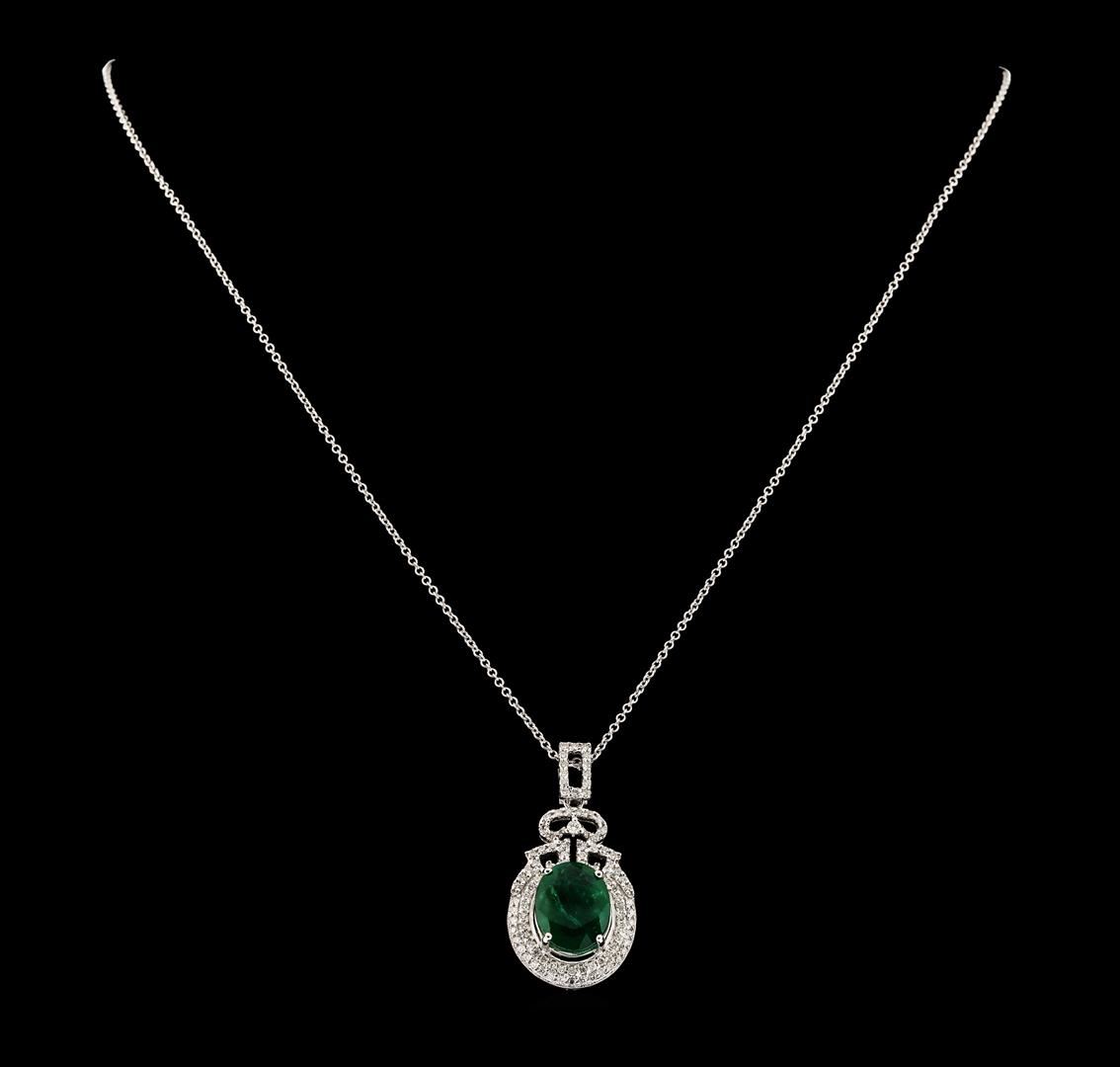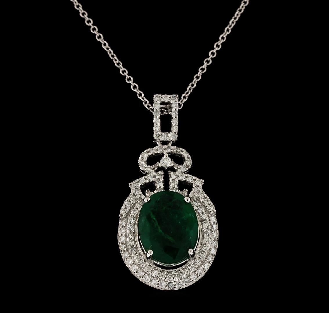 One electronically tested 14KT white gold lady's combination cast & assembled fashion pendant & chain 18.0' long, 1.25mm round cable link with a lobster claw clasp with a double basket halo with a bright polish finish. The featured lady's pendant has a drop of 33 millimeters. Identified with markings of 'K14'. Condition is new, good workmanship. Containing: One prong set oval modified mixed cut natural emerald, measuring 12.25 x 9.55 x 5.62mm, (depth est.) 14%. bulge factor, approximate weight of 4.26ct., clarity is heavily included, medium, moderately strong, green color, (GIA G 5/4), cut is good. Transmitting light somewhat diffusely, transparent to translucent. Naturally occurring internal & external characteristics are present. Indications of oil residue. Colored gemstones are presumed to have been subjected to commonly used enhancement processes. Graded in the setting. One prong set round brilliant cut diamond, measuring 2.00 - 1.95 x 1.23mm (depth est.) approximate weight of 0.03ct. Graded in the setting. Clarity SI-2. Color: H Cut Good Ninety-Four prong set round brilliant cut diamonds, measuring 1.25 - 1.15 x 0.74mm (depth est.) approximate total weight of 94 Stones = 0.62ct. Graded in the setting. Clarity SI-1 to SI-2. Color: G - H Cut Good. Total Weight of Colored Stones 4.26ct.. Total Weight of Diamonds 0.65ct.. Total Weight of Pendant & Chain 6.00gm GAS Appraised at $7,680.00.