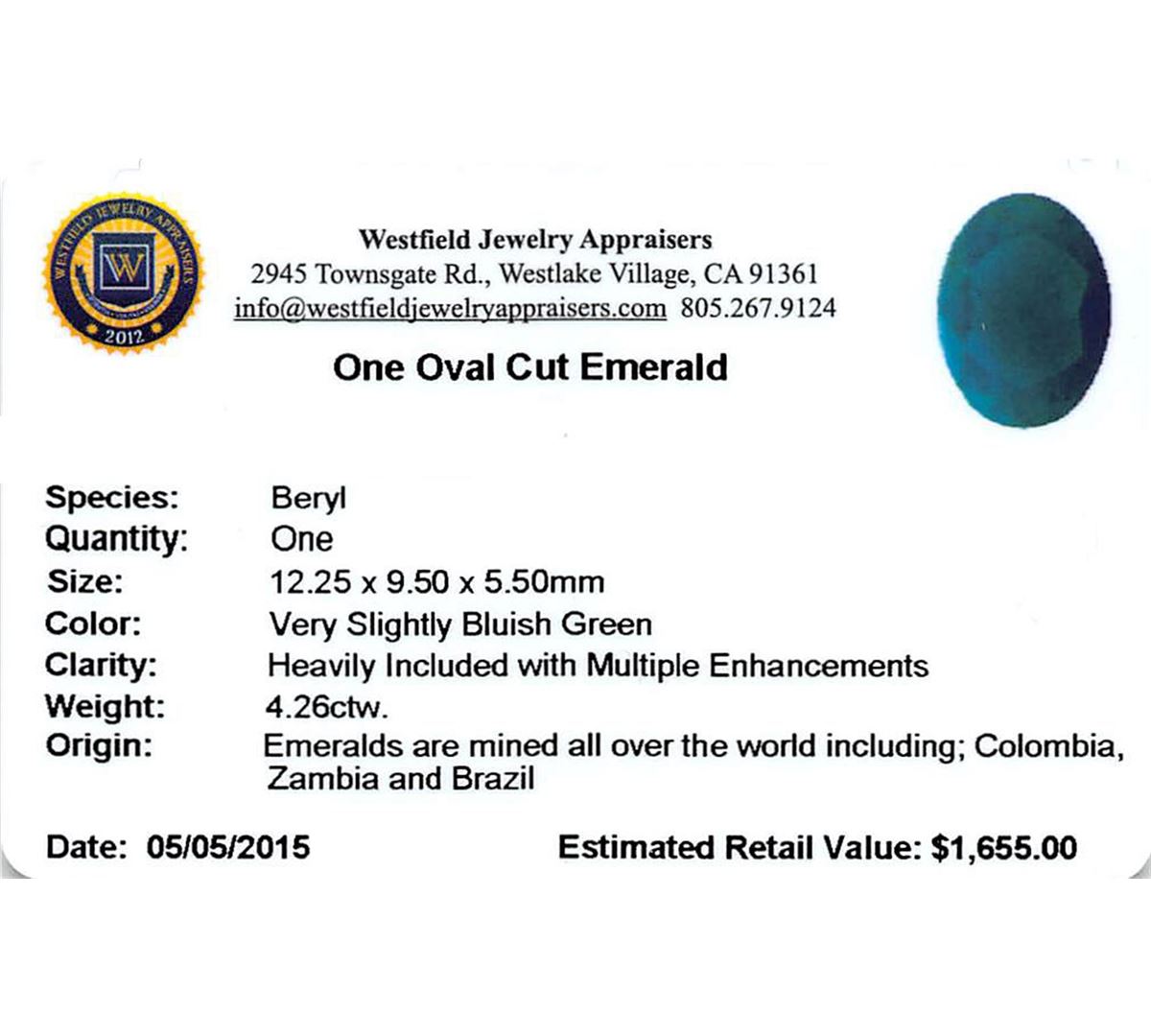 One oval mixed cut natural emerald, measuring 12.25 x 9.50 x 5.50mm, exact weight 4.26ct., clarity is heavily included, type III, medium dark, very slightly bluish green color, (GIA vslbG 6/0) Indications of multiple laboratory enhancements, including high temperature heat treatment. Westfield Appraised at $1,655.00.