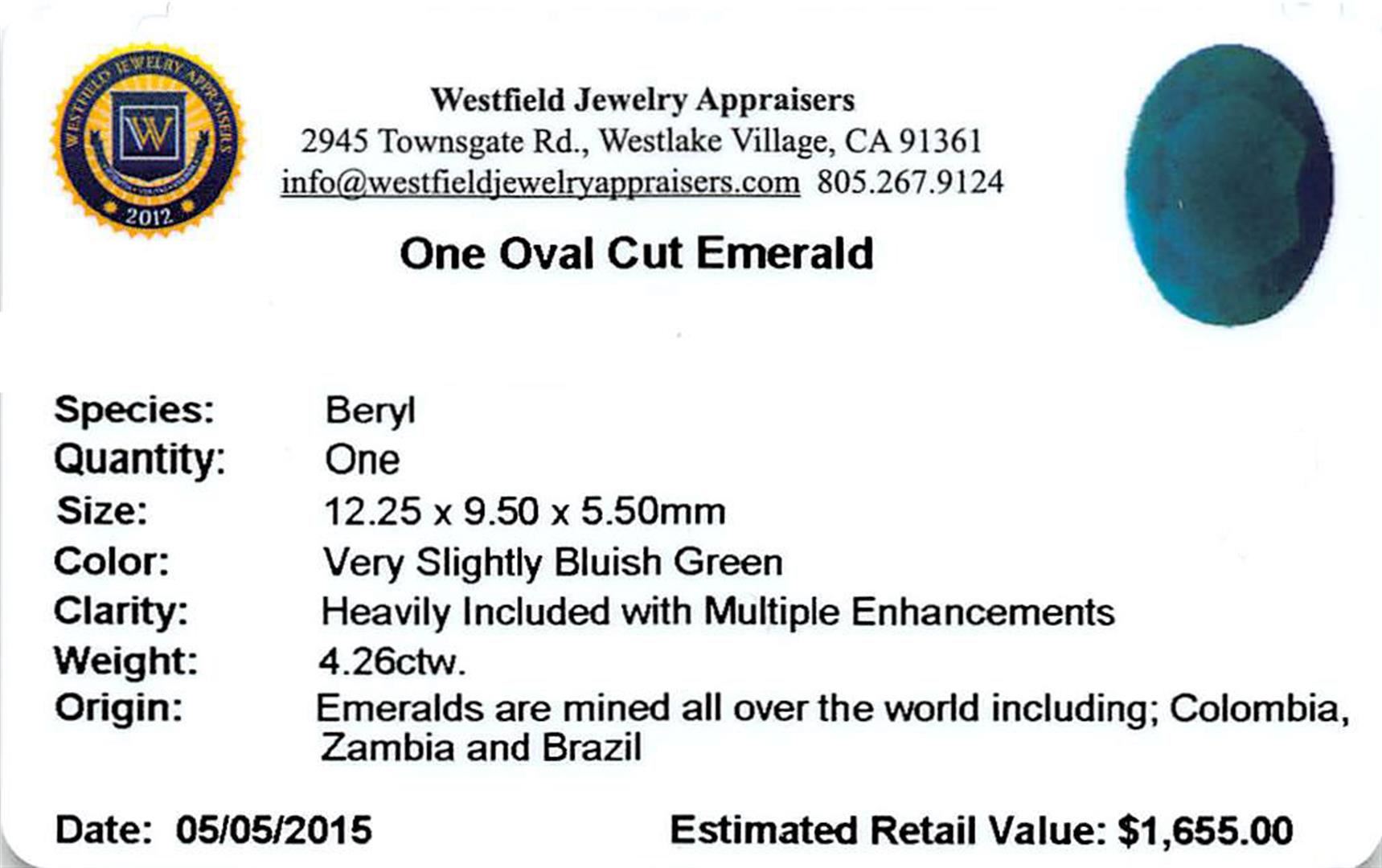 One oval mixed cut natural emerald, measuring 12.25 x 9.50 x 5.50mm, exact weight 4.26ct., clarity is heavily included, type III, medium dark, very slightly bluish green color, (GIA vslbG 6/0) Indications of multiple laboratory enhancements, including high temperature heat treatment. Westfield Appraised.