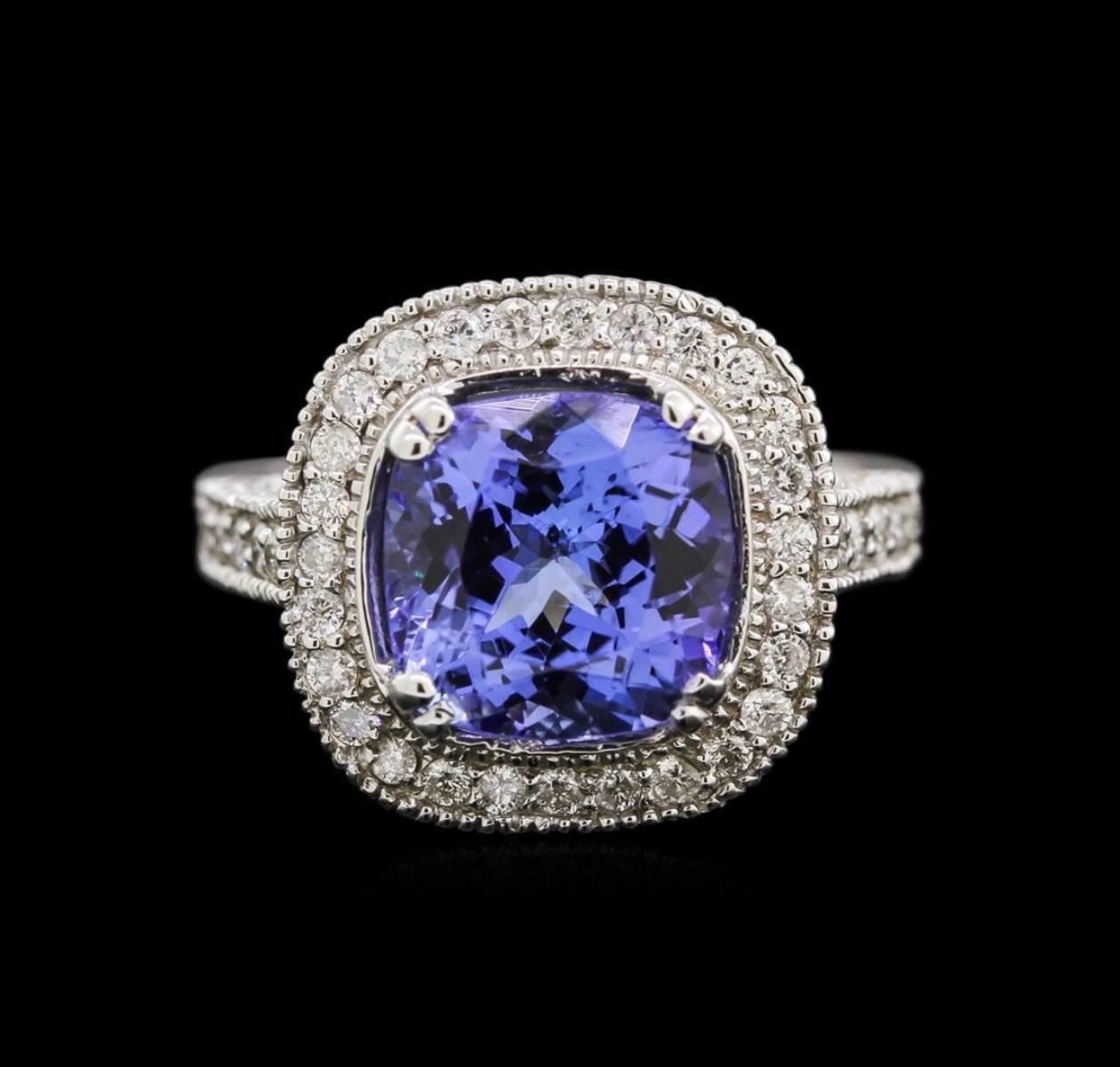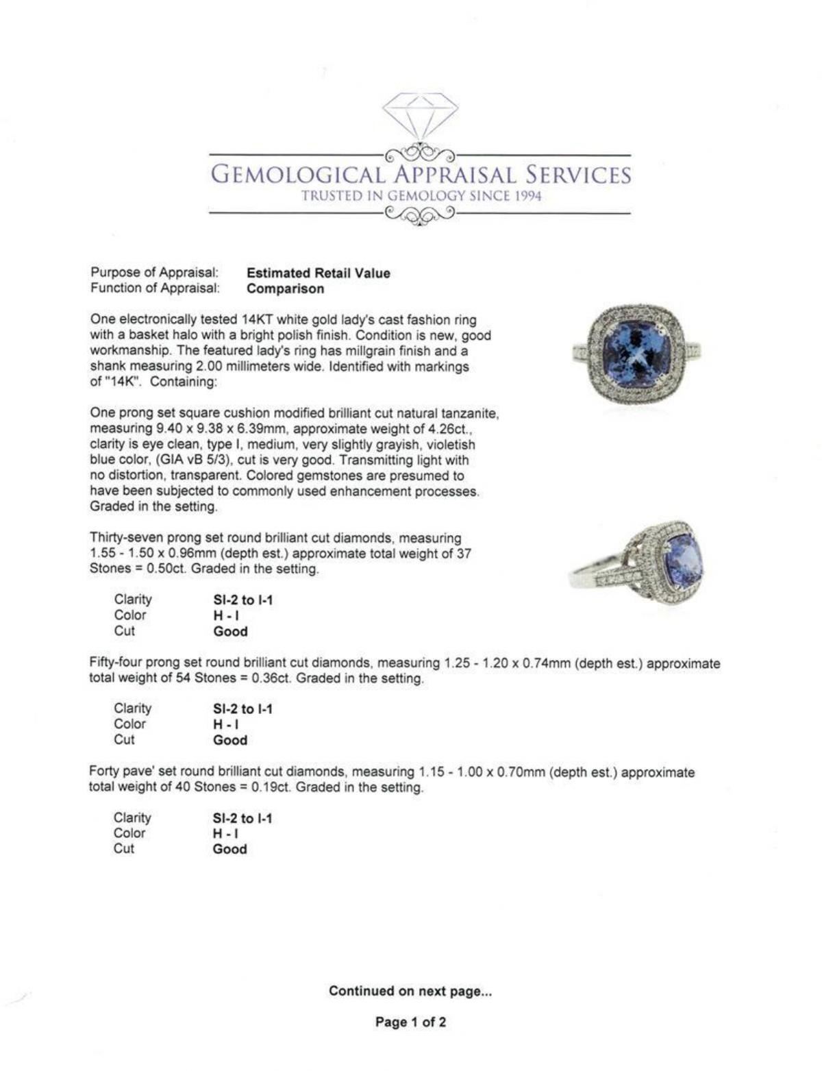 One electronically tested 14KT white gold lady's cast fashion ring with a basket halo with a bright polish finish. The featured lady's ring has milgrain finish and a shank measuring 2.00 millimeters wide. Identified with markings of "14K". Condition is new, good workmanship. Containing: One prong set square cushion modified brilliant cut natural tanzanite, measuring 9.40 x 9.38 x 6.39mm, approximate weight of 4.26ct., clarity is eye clean, type I, medium, very slightly grayish, violetish blue color, (GIA vB 5/3), cut is very good. Transmitting light with no distortion, transparent. Colored gemstones are presumed to have been subjected to commonly used enhancement processes. Graded in the setting. Thirty-Seven prong set round brilliant cut diamonds, measuring 1.55 - 1.50 x 0.96mm (depth est.) approximate total weight of 37 Stones = 0.50ct. Graded in the setting. Clarity: SI-2 to I-1. Color: H - I. Cut Good Fifty-Four prong set round brilliant cut diamonds, measuring 1.25 - 1.20 x 0.74mm (depth est.) approximate total weight of 54 Stones = 0.36ct. Graded in the setting. Clarity: SI-2 to I-1. Color: H - I. Cut Good Forty pave' set round brilliant cut diamonds, measuring 1.15 - 1.00 x 0.70mm (depth est.) approximate total weight of 40 Stones = 0.19ct. Graded in the setting. Clarity: SI-2 to I-1. Color: H - I. Cut Good. Total Weight of Colored Stones 4.26ct. Total Weight of Diamonds 1.05ct. Total Weight of Ring 6.90gm. GAS Appraised.