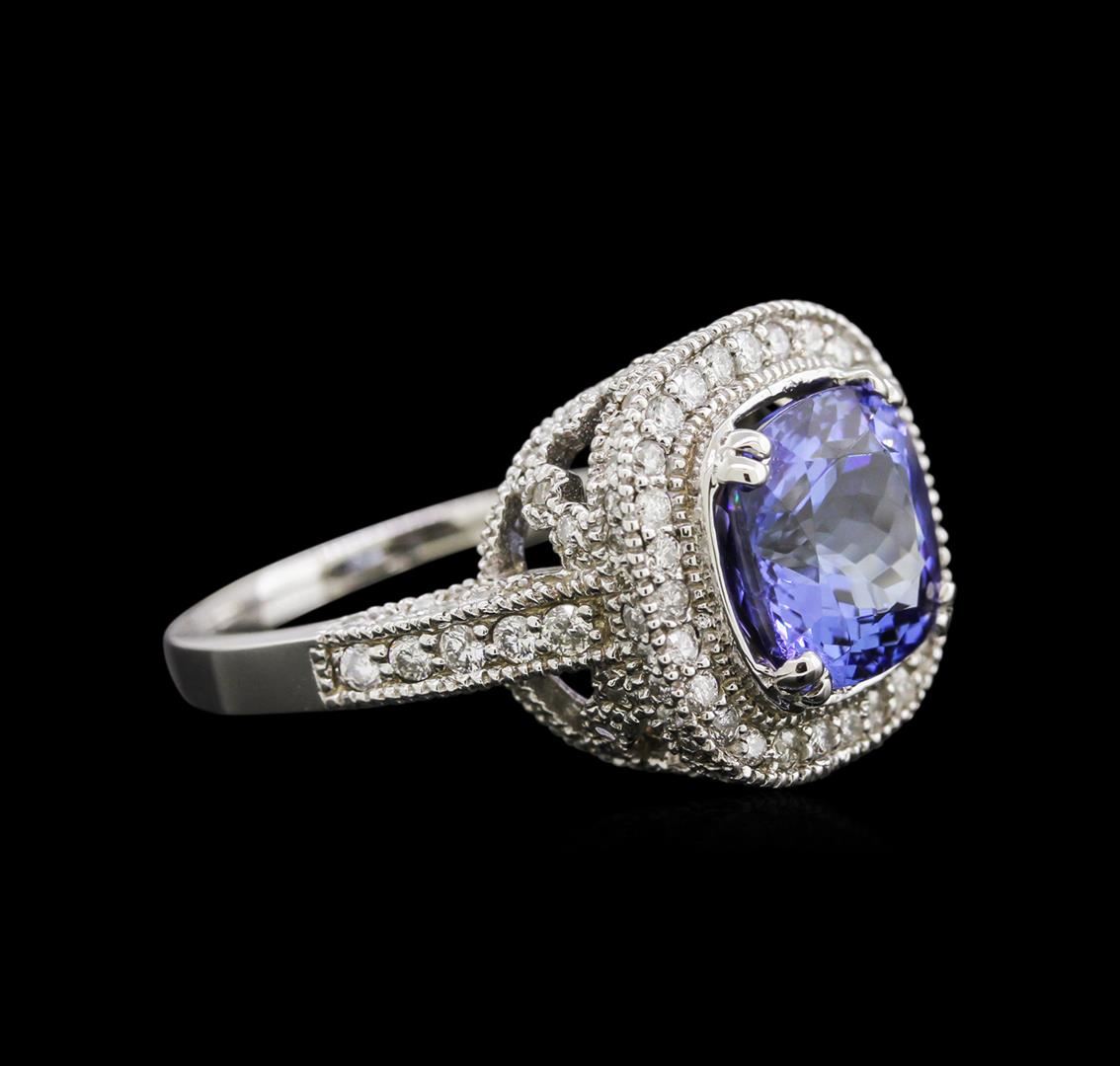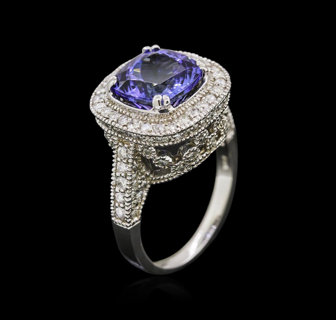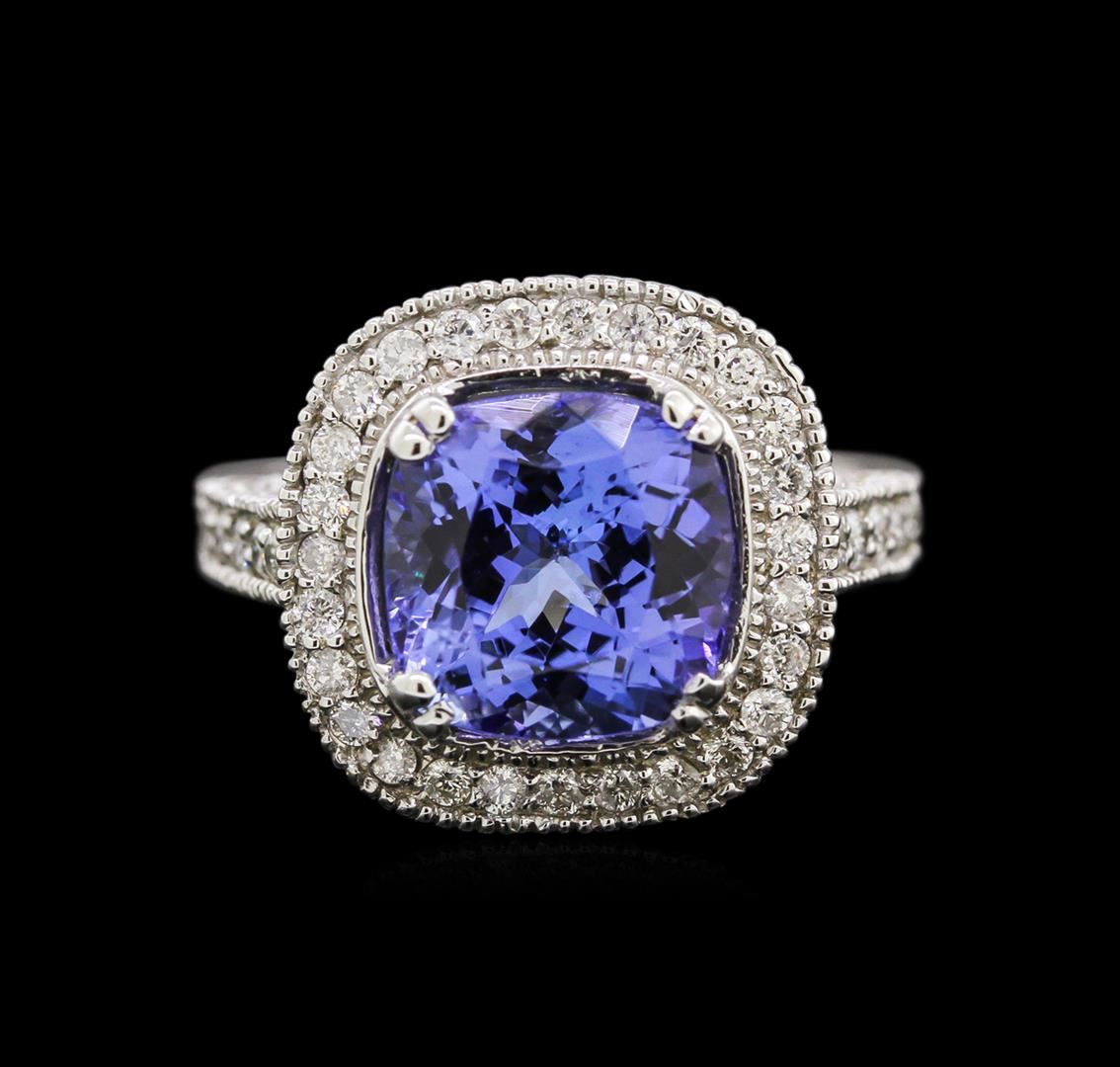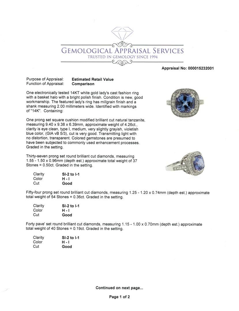 One electronically tested 14KT white gold lady's cast fashion ring with a basket halo with a bright polish finish. The featured lady's ring has milgrain finish and a shank measuring 2.00 millimeters wide. Identified with markings of "14K". Condition is new, good workmanship. Containing: One prong set square cushion modified brilliant cut natural tanzanite, measuring 9.40 x 9.38 x 6.39mm, approximate weight of 4.26ct., clarity is eye clean, type I, medium, very slightly grayish, violetish blue color, (GIA vB 5/3), cut is very good. Transmitting light with no distortion, transparent. Colored gemstones are presumed to have been subjected to commonly used enhancement processes. Graded in the setting. Thirty-Seven prong set round brilliant cut diamonds, measuring 1.55 - 1.50 x 0.96mm (depth est.) approximate total weight of 37 Stones = 0.50ct. Graded in the setting. Clarity: SI-2 to I-1. Color: H - I. Cut Good Fifty-Four prong set round brilliant cut diamonds, measuring 1.25 - 1.20 x 0.74mm (depth est.) approximate total weight of 54 Stones = 0.36ct. Graded in the setting. Clarity: SI-2 to I-1. Color: H - I. Cut Good Forty pave' set round brilliant cut diamonds, measuring 1.15 - 1.00 x 0.70mm (depth est.) approximate total weight of 40 Stones = 0.19ct. Graded in the setting. Clarity: SI-2 to I-1. Color: H - I. Cut Good. Total Weight of Colored Stones 4.26ct. Total Weight of Diamonds 1.05ct. Total Weight of Ring 6.90gm. GAS Appraised at $9,465.00.