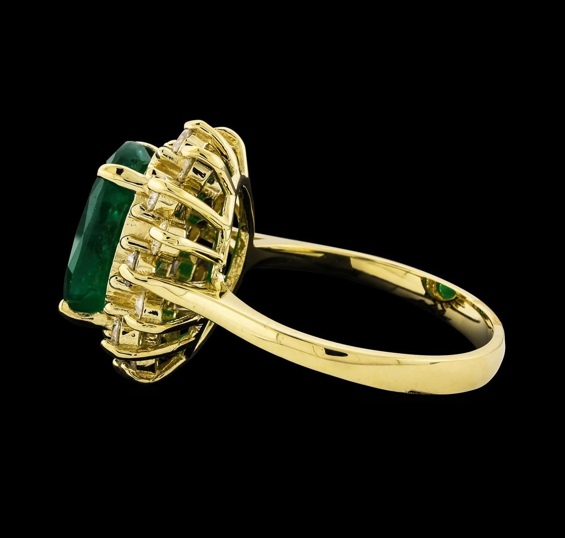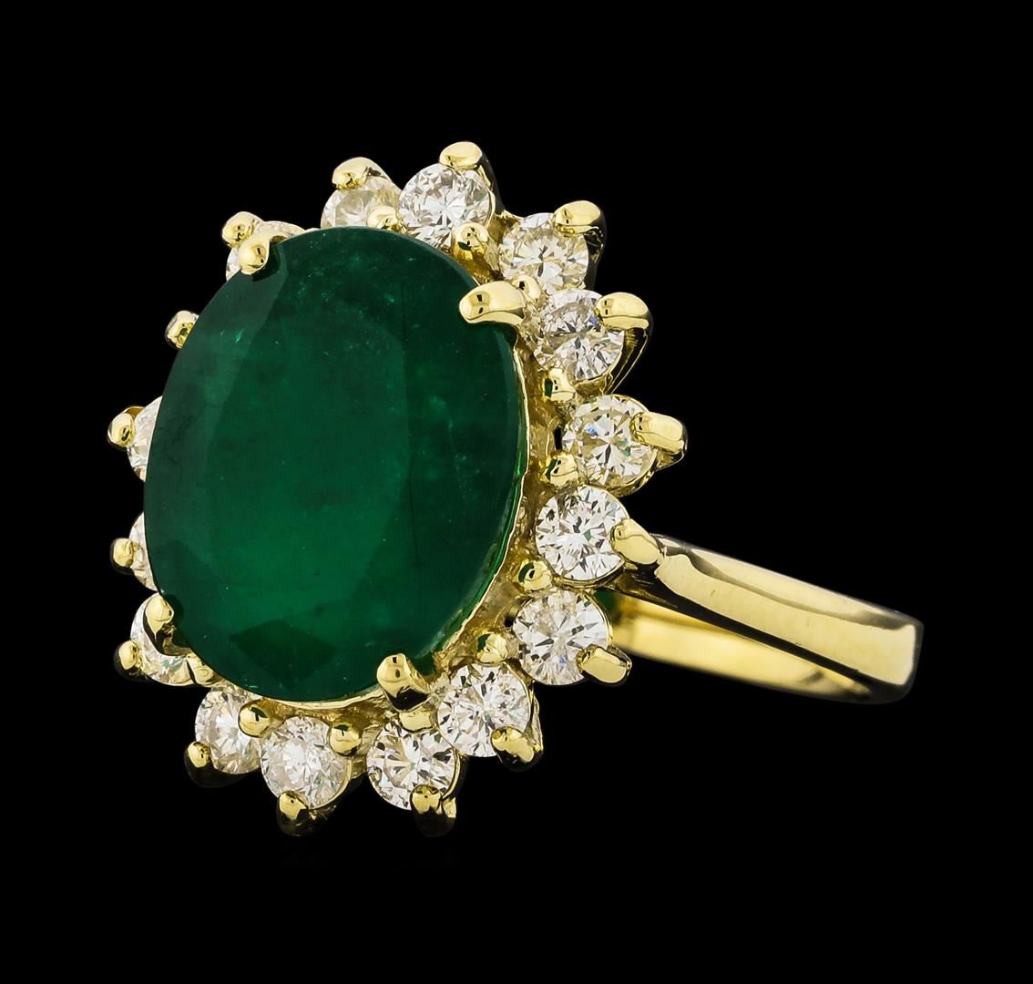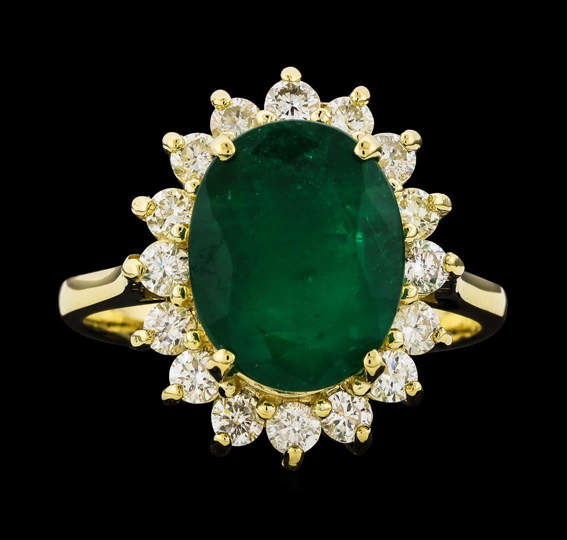 One electronically tested 14KT yellow gold lady's cast fashion ring with a staggered basket halo with a bright polish finish. The featured lady's ring has a shank measuring 2.67 millimeters wide. Identified with markings of 'K14'. Condition is new, good workmanship. Containing: One prong set oval modified mixed cut natural emerald, measuring 12.04 x 9.49 x 5.55mm, (depth est.) 15%. bulge factor, approximate weight of 4.27ct., clarity is heavily included, medium, moderately strong, green color, (GIA G 5/4), cut is good. Transmitting light somewhat diffusely, semi-transparent to translucent. Naturally occurring internal & external characteristics are present. Indications of oil residue. Colored gemstones are presumed to have been subjected to commonly used enhancement processes. Graded in the setting. Sixteen prong set round brilliant cut diamonds, measuring 2.50 - 2.40 x 1.47mm (depth est.) approximate total weight of 16 Stones = 0.83ct. Graded in the setting. Clarity SI-1 to SI-3. Color: H - I Cut Good. Total Weight of Colored Stones 4.27ct.. Total Weight of Diamonds 0.83ct.. Total Weight of Ring 5.50gm. GAS Appraised at $8,320.00.