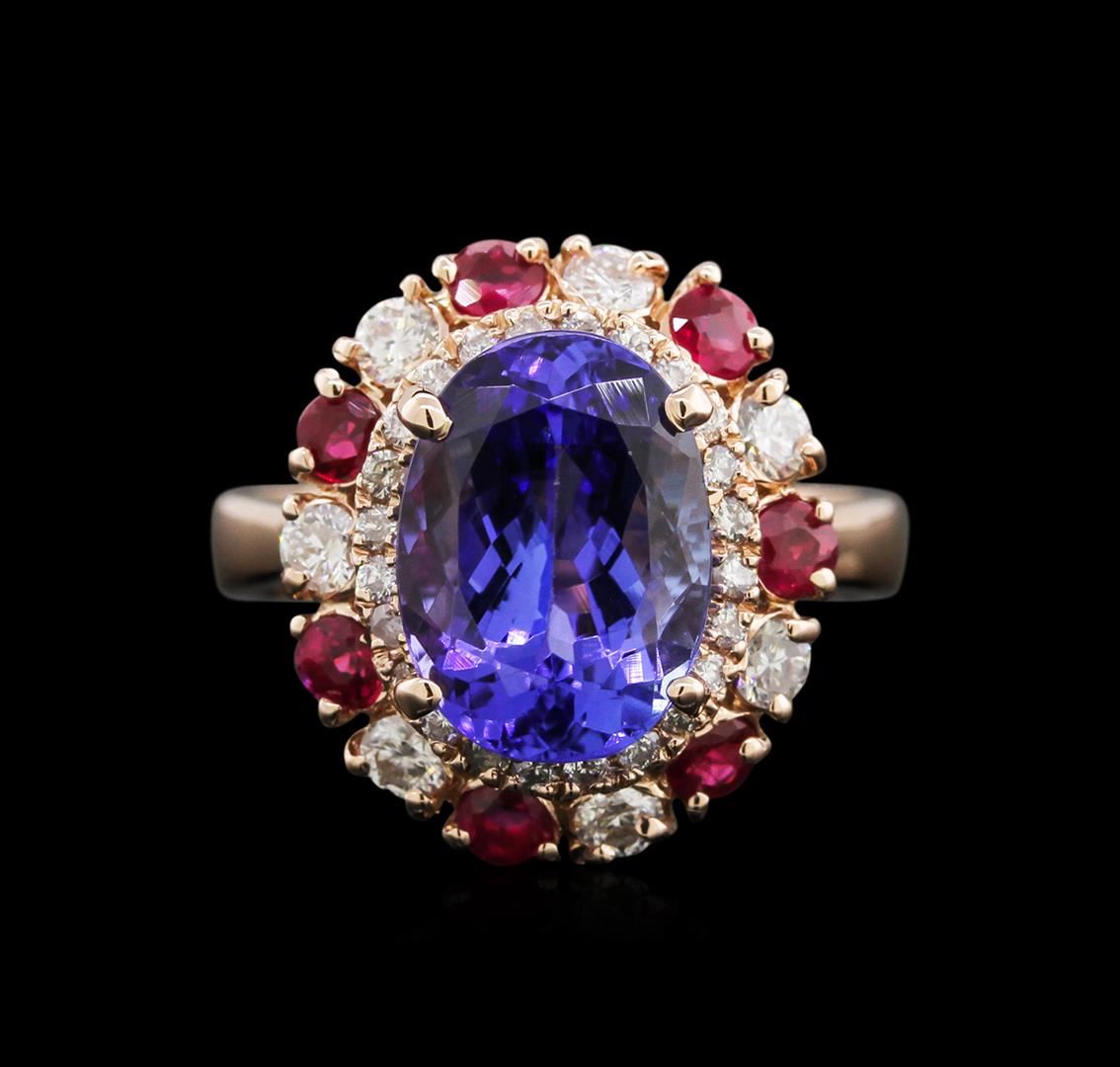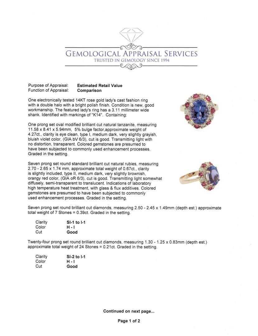 One electronically tested 14KT rose gold lady's cast fashion ring with a double halo with a bright polish finish. The featured lady's ring has a 3.11 millimeter wide shank. Identified with markings of "K14". Condition is new, good workmanship. Containing: One prong set oval modified brilliant cut natural tanzanite, measuring 11.58 x 8.41 x 5.94mm, 5% bulge factor, approximate weight of 4.27ct., clarity is eye clean, type I, medium dark, very slightly grayish, bluish violet color, (GIA bV 6/3), cut is good. Transmitting light with no distortion, transparent. Colored gemstones are presumed to have been subjected to commonly used enhancement processes. Graded in the setting. Seven prong set round standard brilliant cut natural rubies, measuring 2.70 - 2.65 x 1.74 mm, approximate total weight of 0.67ct., clarity is slightly included, type II, medium dark, very slightly brownish, orangy red color, (GIA oR 6/3), cut is good. Transmitting light somewhat diffusely, semi-transparent to translucent. Indications of laboratory high temperature heat treatment, with glass & flux additives. Colored gemstones are presumed to have been subjected to commonly used enhancement processes. Graded in the setting. Seven prong set round brilliant cut diamonds, measuring 2.50 - 2.45 x 1.49mm (depth est.) approximate total weight of 7 Stones = 0.39ct. Graded in the setting. Clarity: SI-1 to I-1. Color: H - I. Cut Good Twenty-Four prong set round brilliant cut diamonds, measuring 1.30 - 1.25 x 0.83mm (depth est.) approximate total weight of 24 Stones = 0.21ct. Graded in the setting. Clarity: SI-2 to I-1. Color: H - I. Cut Good. Total Weight of Colored Stones 4.94ct. Total Weight of Diamonds 0.60ct. Total Weight of Ring 5.70gm. GAS Appraised at $7,505.00.