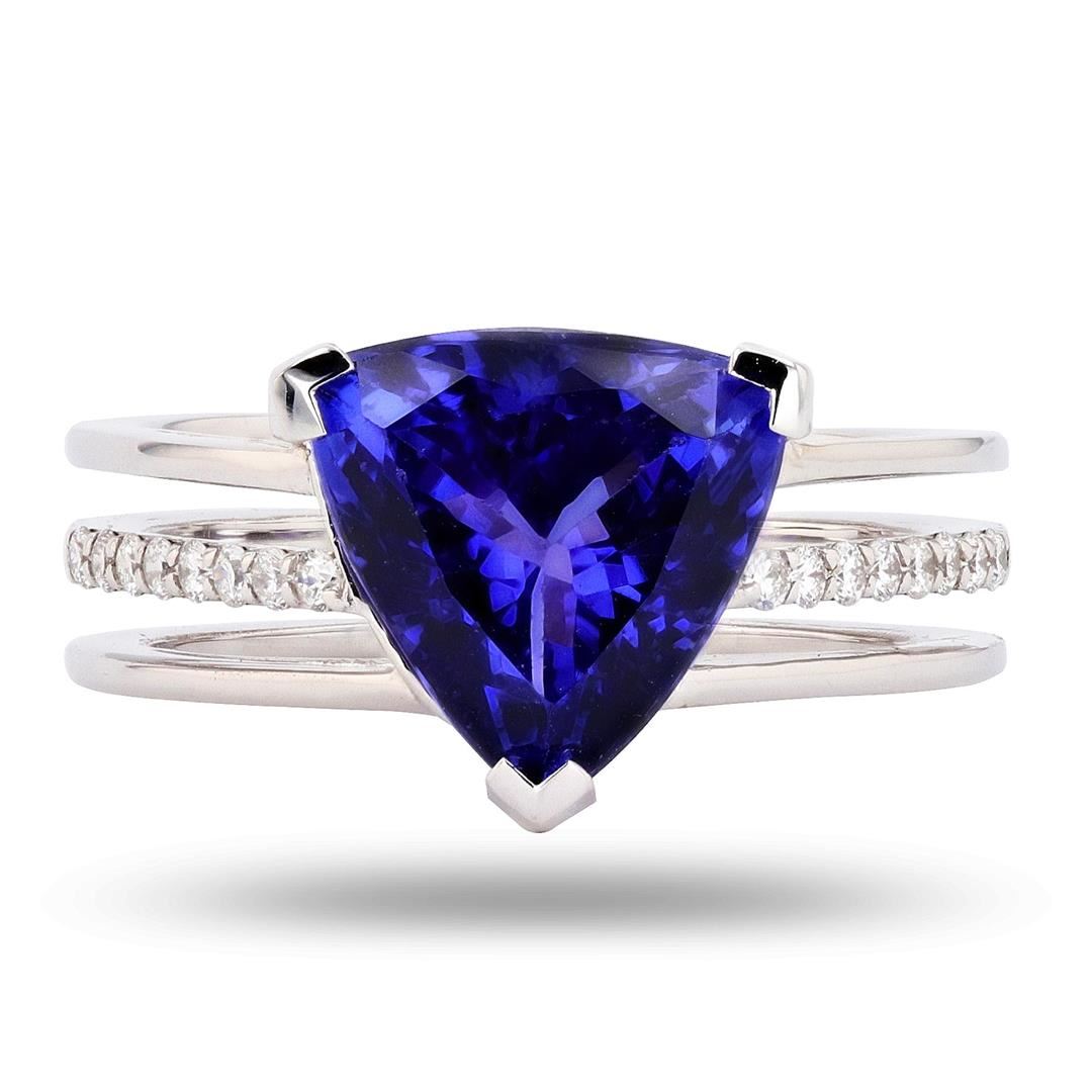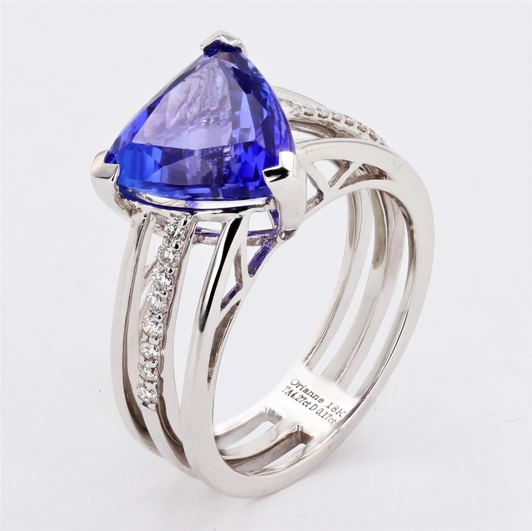 4.27ct Tanzanite and 0.17ctw Diamond 18K White Gold Ring. One polished, stamped, and tested I8K white gold ring with a bright finish. The ring is mounted with 1 genuine tanzanite center stone weighing approximately 4.27 carat, and 16 genuine round diamonds weighing approximately 0.17 carats. This item weighs 5.8 grams, condition is new, excellent workmanship. MAIN GEMSTONE Species: Zoisite Variety: Tanzanite Shape: Triangular Cutting Style: Modified Brilliant Cut Measurements: 9.8 x 9.5 x 6.6 mm Weight: 4.27 carat Color: Violetish Blue Cut Grade: Very Good Refractive Index: 1.691 - 1.700 DR Birefringence: 0.008 - 0.013 Hardness: 6.5 - 7 ADJACENT GEMSTONES ON RING Identity: Natural Diamond Shape: Round Cutting Style: Brilliant Cut Quantity: 16 Diamonds Measurements: 1.3mm Total Weight: 0.17 carats Clarity Grade: SI1 Color Grade: G Refractive Index: 2.418 Hardness: 10 TANZANITE WEIGHT: 4.27ct TOTAL DIAMOND WEIGHT: 0.17ctw WEIGHT OF ITEM: 5.8 grams GOLD CONTENT: 18K White Gold