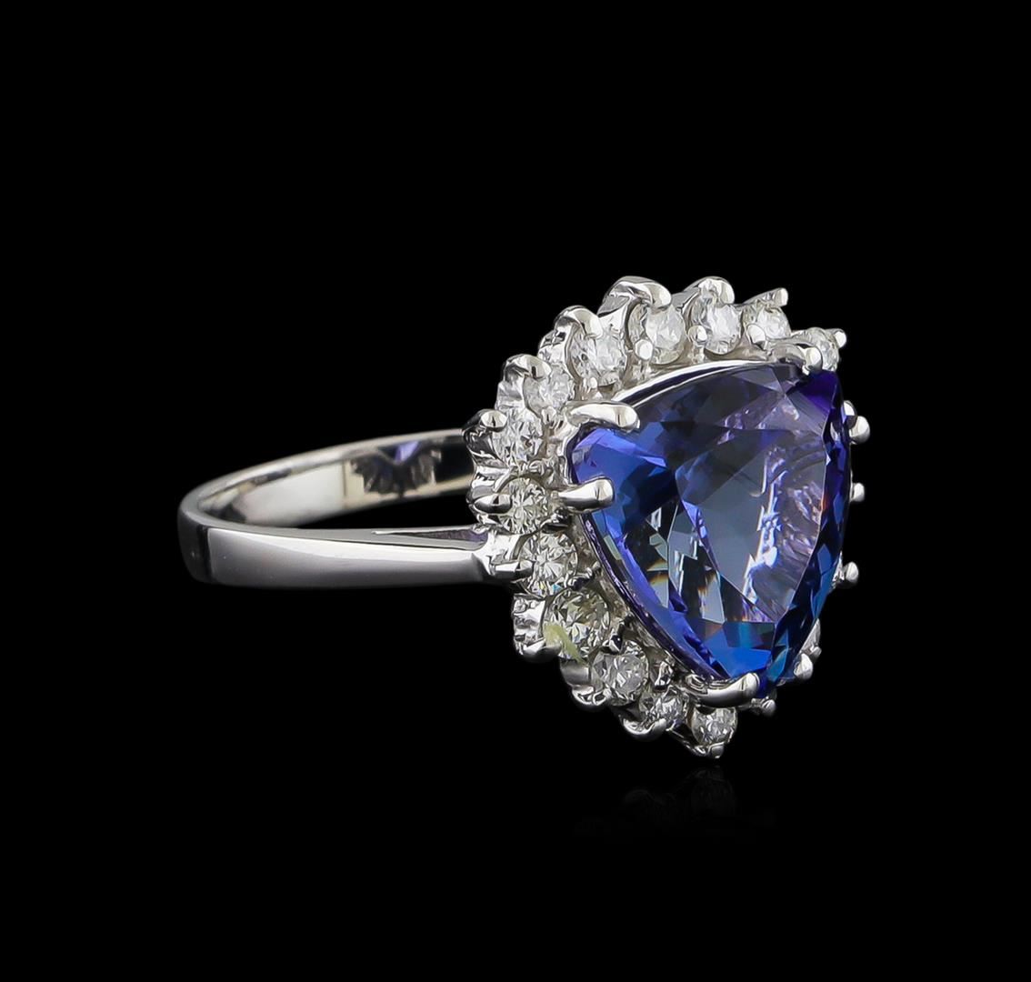 One electronically tested 14KT white gold lady's cast fashion ring with a basket halo with a bright polish finish. The featured lady's ring has a shank measuring 2.37 millimeters wide. Identified with markings of "K14". Condition is new, good workmanship. Containing: One prong set triangle modified brilliant cut natural tanzanite, measuring 11.14 x 10.85 x 6.18mm, approximate weight of 4.27ct., clarity is eye clean, type I, medium dark, very slightly grayish, violetish blue color, (GIA vB 6/3), cut is very good. Transmitting light with no distortion, transparent. Colored gemstones are presumed to have been subjected to commonly used enhancement processes. Graded in the setting. Eighteen prong set round brilliant cut diamonds, measuring 2.30 - 1.80 x 1.27mm (depth est.) approximate total weight of 18 Stones = 0.60ct. Graded in the setting. Clarity: SI-1 to I-1. Color: G - Good. Total Weight of Colored Stones 4.27ct. Total Weight of Diamonds 0.60ct. Total Weight of Ring 5.00gm. GAS Appraised at $9,005.00.