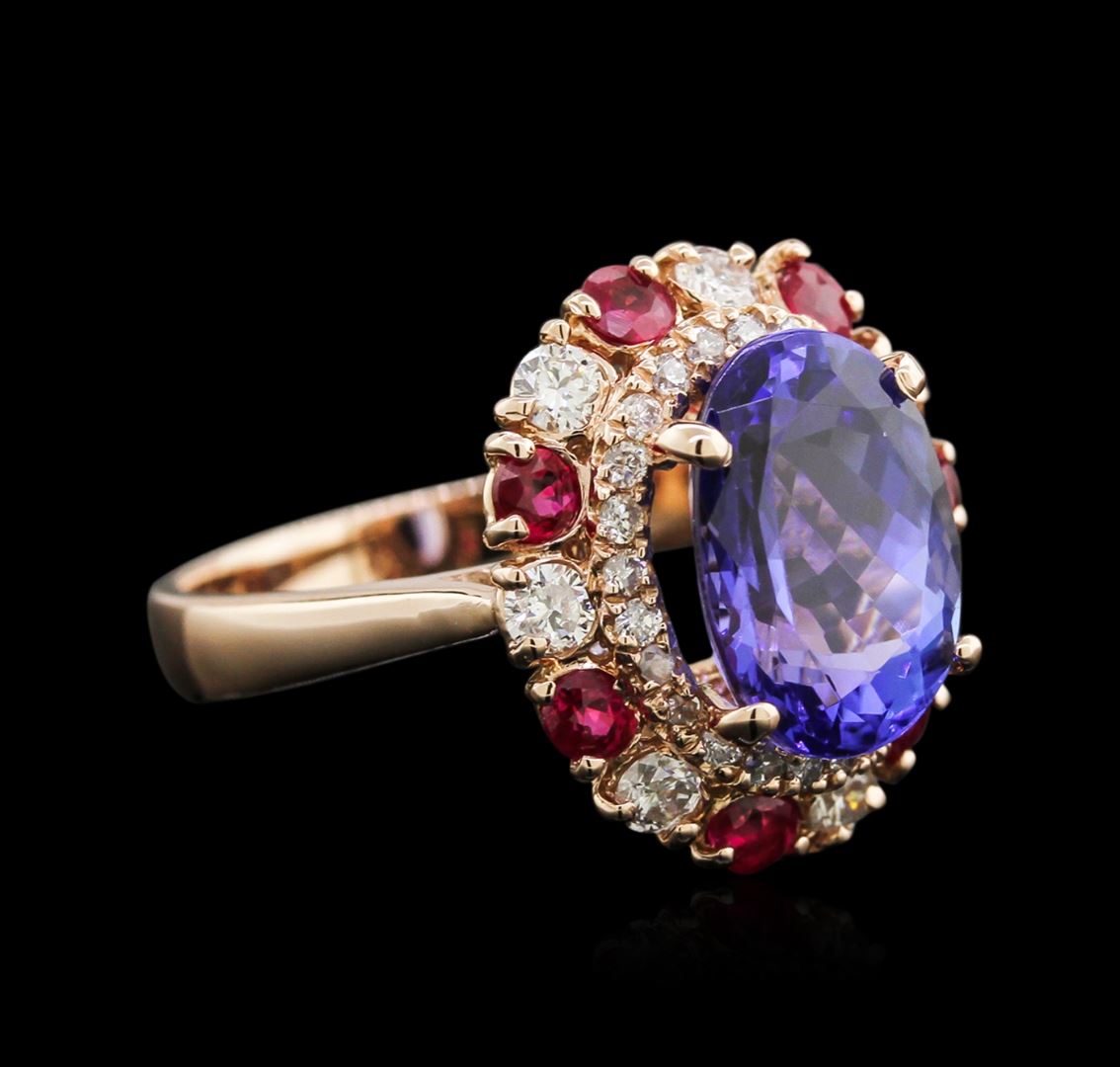 One electronically tested 14KT rose gold lady's cast fashion ring with a double halo with a bright polish finish. The featured lady's ring has a 3.11 millimeter wide shank. Identified with markings of "K14". Condition is new, good workmanship. Containing: One prong set oval modified brilliant cut natural tanzanite, measuring 11.58 x 8.41 x 5.94mm, 5% bulge factor, approximate weight of 4.27ct., clarity is eye clean, type I, medium dark, very slightly grayish, bluish violet color, (GIA bV 6/3), cut is good. Transmitting light with no distortion, transparent. Colored gemstones are presumed to have been subjected to commonly used enhancement processes. Graded in the setting. Seven prong set round standard brilliant cut natural rubies, measuring 2.70 - 2.65 x 1.74 mm, approximate total weight of 0.67ct., clarity is slightly included, type II, medium dark, very slightly brownish, orangy red color, (GIA oR 6/3), cut is good. Transmitting light somewhat diffusely, semi-transparent to translucent. Indications of laboratory high temperature heat treatment, with glass & flux additives. Colored gemstones are presumed to have been subjected to commonly used enhancement processes. Graded in the setting. Seven prong set round brilliant cut diamonds, measuring 2.50 - 2.45 x 1.49mm (depth est.) approximate total weight of 7 Stones = 0.39ct. Graded in the setting. Clarity: SI-1 to I-1. Color: H - I. Cut Good Twenty-Four prong set round brilliant cut diamonds, measuring 1.30 - 1.25 x 0.83mm (depth est.) approximate total weight of 24 Stones = 0.21ct. Graded in the setting. Clarity: SI-2 to I-1. Color: H - I. Cut Good. Total Weight of Colored Stones 4.94ct. Total Weight of Diamonds 0.60ct. Total Weight of Ring 5.70gm. GAS Appraised at $7,505.00.