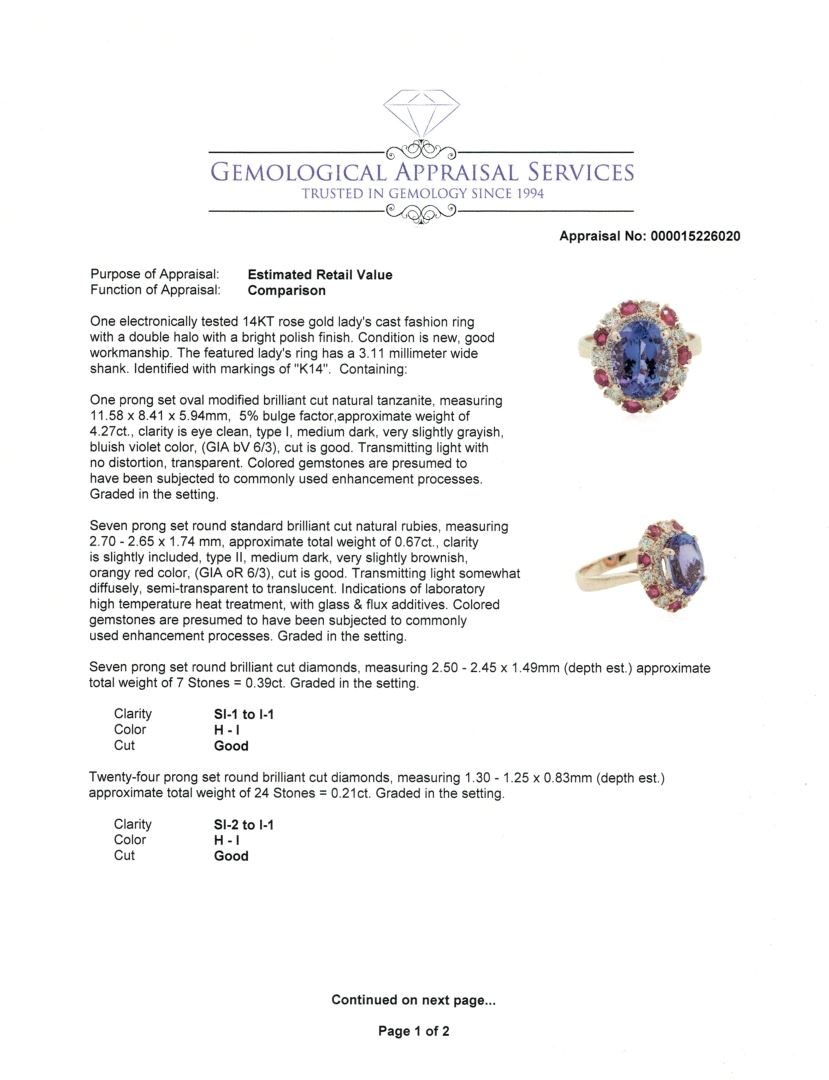 One electronically tested 14KT rose gold lady's cast fashion ring with a double halo with a bright polish finish. The featured lady's ring has a 3.11 millimeter wide shank. Identified with markings of "K14". Condition is new, good workmanship. Containing: One prong set oval modified brilliant cut natural tanzanite, measuring 11.58 x 8.41 x 5.94mm, 5% bulge factor, approximate weight of 4.27ct., clarity is eye clean, type I, medium dark, very slightly grayish, bluish violet color, (GIA bV 6/3), cut is good. Transmitting light with no distortion, transparent. Colored gemstones are presumed to have been subjected to commonly used enhancement processes. Graded in the setting. Seven prong set round standard brilliant cut natural rubies, measuring 2.70 - 2.65 x 1.74 mm, approximate total weight of 0.67ct., clarity is slightly included, type II, medium dark, very slightly brownish, orangy red color, (GIA oR 6/3), cut is good. Transmitting light somewhat diffusely, semi-transparent to translucent. Indications of laboratory high temperature heat treatment, with glass & flux additives. Colored gemstones are presumed to have been subjected to commonly used enhancement processes. Graded in the setting. Seven prong set round brilliant cut diamonds, measuring 2.50 - 2.45 x 1.49mm (depth est.) approximate total weight of 7 Stones = 0.39ct. Graded in the setting. Clarity: SI-1 to I-1. Color: H - I. Cut Good Twenty-Four prong set round brilliant cut diamonds, measuring 1.30 - 1.25 x 0.83mm (depth est.) approximate total weight of 24 Stones = 0.21ct. Graded in the setting. Clarity: SI-2 to I-1. Color: H - I. Cut Good. Total Weight of Colored Stones 4.94ct. Total Weight of Diamonds 0.60ct. Total Weight of Ring 5.70gm. GAS Appraised at $7,505.00.