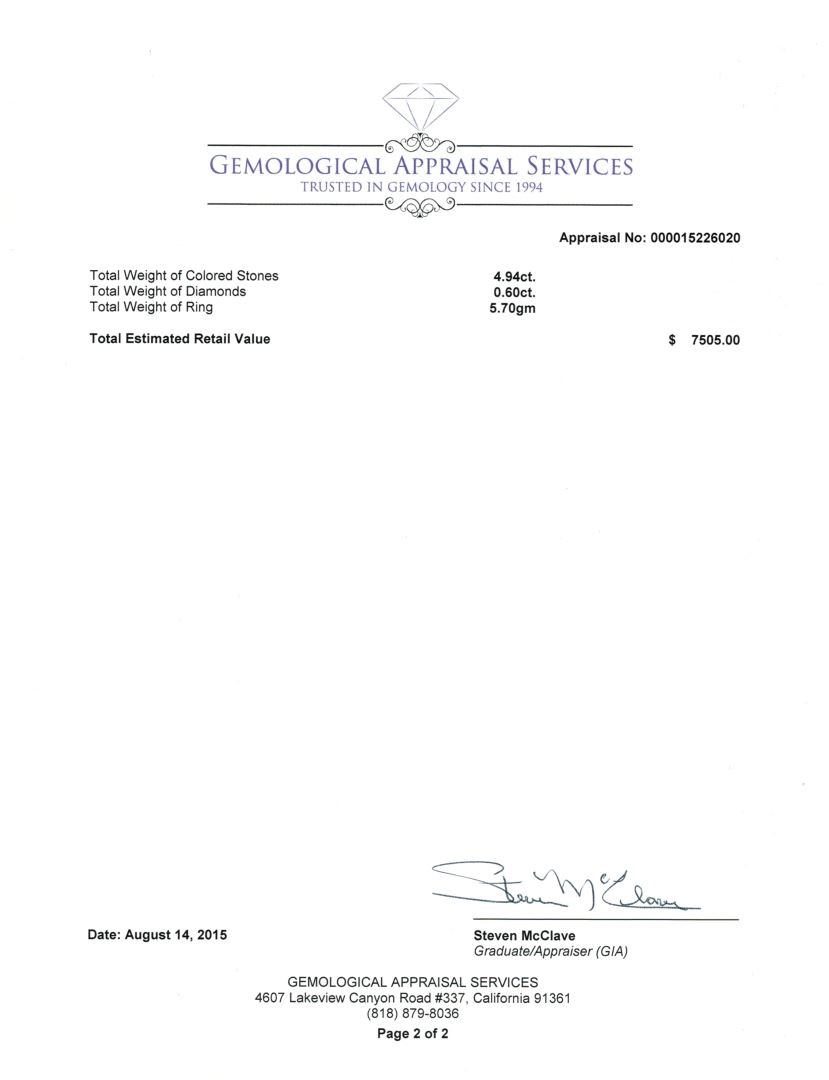 Not all Jewelry, watches or loose stones are appraised and the appraisals are provided for bidders only in certain instances at the discretion of SAA. Our appraisals are conducted by independent third-party appraisal firms. Such firms may be certified GIA Gemologists or have education in the industry or alternative certifications. Appraisals should be used for verification of gemstone and/or metal weight, size, and grade only, not actual value for resale or insurance purposes. Appraisal value should be not considered for actual value, as price varies greatly from retail locations and other merchants in different geographic locations. All Items auctioned by SAA should not be purchased with a view or expectation toward resale for appraisal price given, or to make a profit. The ultimate value for which an item can be resold may vary drastically from the appraisals listed by SAA.