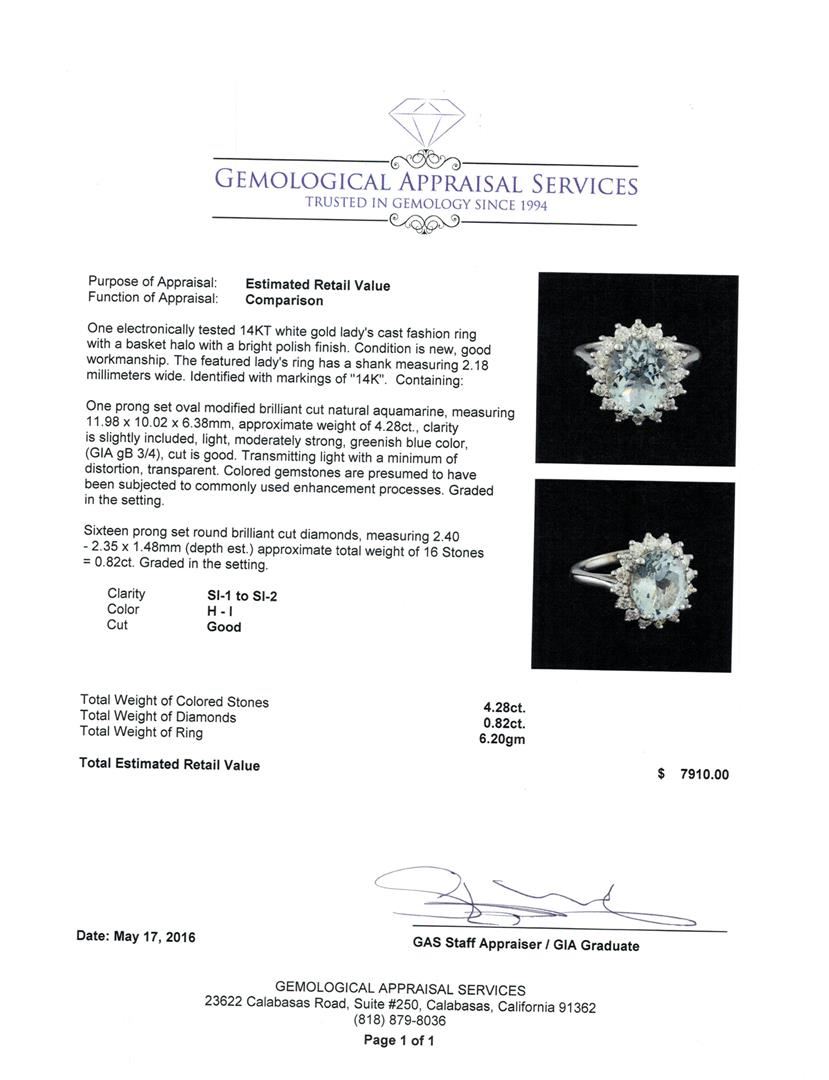 One electronically tested 14KT white gold lady's cast fashion ring with a basket halo with a bright polish finish. The featured lady's ring has a shank measuring 2.18 millimeters wide. Identified with markings of "14K". Condition is new, good workmanship. Containing: One prong set oval modified brilliant cut natural aquamarine, measuring 11.98 x 10.02 x 6.38mm, approximate weight of 4.28ct., clarity is slightly included, light, moderately strong, greenish blue color, (GIA gB 3/4), cut is good. Transmitting light with a minimum of distortion, transparent. Colored gemstones are presumed to have been subjected to commonly used enhancement processes. Graded in the setting. Sixteen prong set round brilliant cut diamonds, measuring 2.40 - 2.35 x 1.48mm (depth est.) approximate total weight of 16 Stones = 0.82ct. Graded in the setting. Clarity: SI-1 to SI-2. Color: H - I. Cut Good. Total Weight of Colored Stones 4.28ct. Total Weight of Diamonds 0.82ct. Total Weight of Ring 6.20gm. GAS Appraised at $7,910.00.
