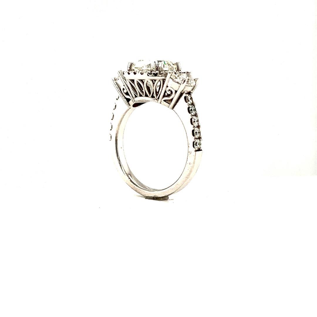 One electronically tested 14KT white gold lady's custom CAD/CAM fashion three stone ring with a cathedral basket halo with a bright polish finish. Condition is new, good workmanship. The featured lady's ring has a shank measuring 2.30 millimeters in width. Identified with markings of "14K". Containing: One prong set cushion cut diamond, measuring 7.94 x 7.81 x 5.55mm (depth est.) , 5.00% GTCF approximate weight of 3.01ct. Clarity of VS-2, color of G, cut is excellent. EGL USA Laboratory Report # US 913531801D.. Two prong set half moon cut diamonds, measuring 6.00 x 3.80 x 0.00mm (depth est.) approximate total weight of 2 Stones = 0.72ct. Clarity of VS-1, color of F - G, cut is excellent. Graded in the setting. Ten prong set round brilliant cut diamonds, measuring 2.10 - 2.00 x 1.27mm (depth est.) approximate total weight of 10 Stones = 0.33ct. Clarity of VS-2 to SI-1, color of G - H, cut is ideal. Graded in the setting. Twenty-two prong set round brilliant cut diamonds, measuring 1.40 - 1.35 x 0.86mm (depth est.) approximate total weight of 22 Stones = 0.22ct. Clarity of VS-2 to SI-1, color of G - H, cut is very good. Graded in the setting. Total Weight of Diamonds 4.28ct. Total Weight of Ring 5.70gm Total Estimated Retail Value $ 125785.00