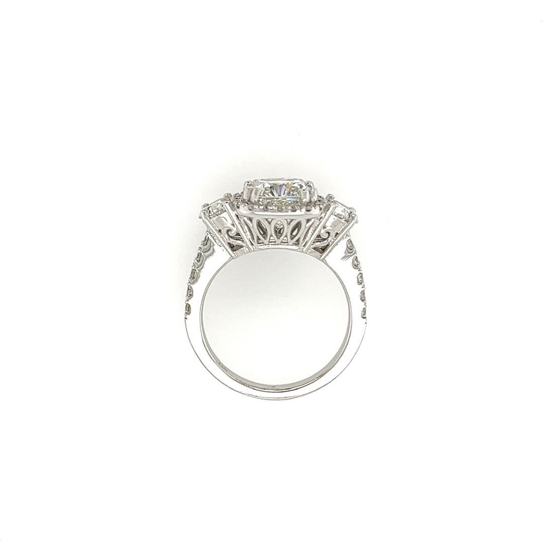 One electronically tested 14KT white gold lady's custom CAD/CAM fashion three stone ring with a cathedral basket halo with a bright polish finish. Condition is new, good workmanship. The featured lady's ring has a shank measuring 2.30 millimeters in width. Identified with markings of "14K". Containing: One prong set cushion cut diamond, measuring 7.94 x 7.81 x 5.55mm (depth est.) , 5.00% GTCF approximate weight of 3.01ct. Clarity of VS-2, color of G, cut is excellent. EGL USA Laboratory Report # US 913531801D.. Two prong set half moon cut diamonds, measuring 6.00 x 3.80 x 0.00mm (depth est.) approximate total weight of 2 Stones = 0.72ct. Clarity of VS-1, color of F - G, cut is excellent. Graded in the setting. Ten prong set round brilliant cut diamonds, measuring 2.10 - 2.00 x 1.27mm (depth est.) approximate total weight of 10 Stones = 0.33ct. Clarity of VS-2 to SI-1, color of G - H, cut is ideal. Graded in the setting. Twenty-two prong set round brilliant cut diamonds, measuring 1.40 - 1.35 x 0.86mm (depth est.) approximate total weight of 22 Stones = 0.22ct. Clarity of VS-2 to SI-1, color of G - H, cut is very good. Graded in the setting. Total Weight of Diamonds 4.28ct. Total Weight of Ring 5.70gm Total Estimated Retail Value $ 125785.00