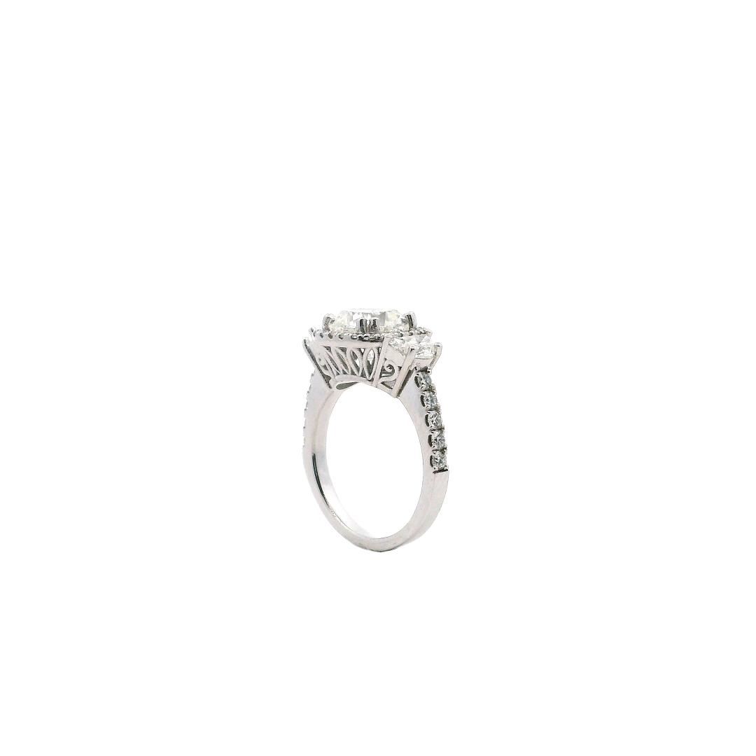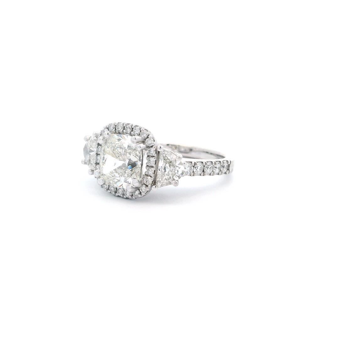 One electronically tested 14KT white gold lady's custom CAD/CAM fashion three stone ring with a cathedral basket halo with a bright polish finish. Condition is new, good workmanship. The featured lady's ring has a shank measuring 2.30 millimeters in width. Identified with markings of "14K". Containing: One prong set cushion cut diamond, measuring 7.94 x 7.81 x 5.55mm (depth est.), 5.00% GTCF approximate weight of 3.01ct. Clarity of VS-2, color of G, cut is excellent. EGL USA Laboratory Report # US 913531801D.. Two prong set half moon cut diamonds, measuring 6.00 x 3.80 x 0.00mm (depth est.) approximate total weight of 2 Stones = 0.72ct. Clarity of VS-1, color of F - G, cut is excellent. Graded in the setting. Ten prong set round brilliant cut diamonds, measuring 2.10 - 2.00 x 1.27mm (depth est.) approximate total weight of 10 Stones = 0.33ct. Clarity of VS-2 to SI-1, color of G - H, cut is ideal. Graded in the setting. Twenty-two prong set round brilliant cut diamonds, measuring 1.40 - 1.35 x 0.86mm (depth est.) approximate total weight of 22 Stones = 0.22ct. Clarity of VS-2 to SI-1, color of G - H, cut is very good. Graded in the setting. Total Weight of Diamonds 4.28ct. Total Weight of Ring 5.70gm Total Estimated Retail Value $ 125785.00