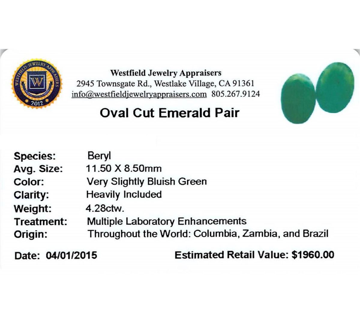 Two oval mixed cut natural emeralds, measuring 11.88 x 8.40 x 3.10mm, approximate total weight of 4.28ct., clarity is heavily included, type III, medium dark, very slightly grayish, green color, (GIA G 6/3), cut is good. Indications of multiple laboratory enhancements, including high temperature heat treatment. Westfield Appraised at $1,960.00.