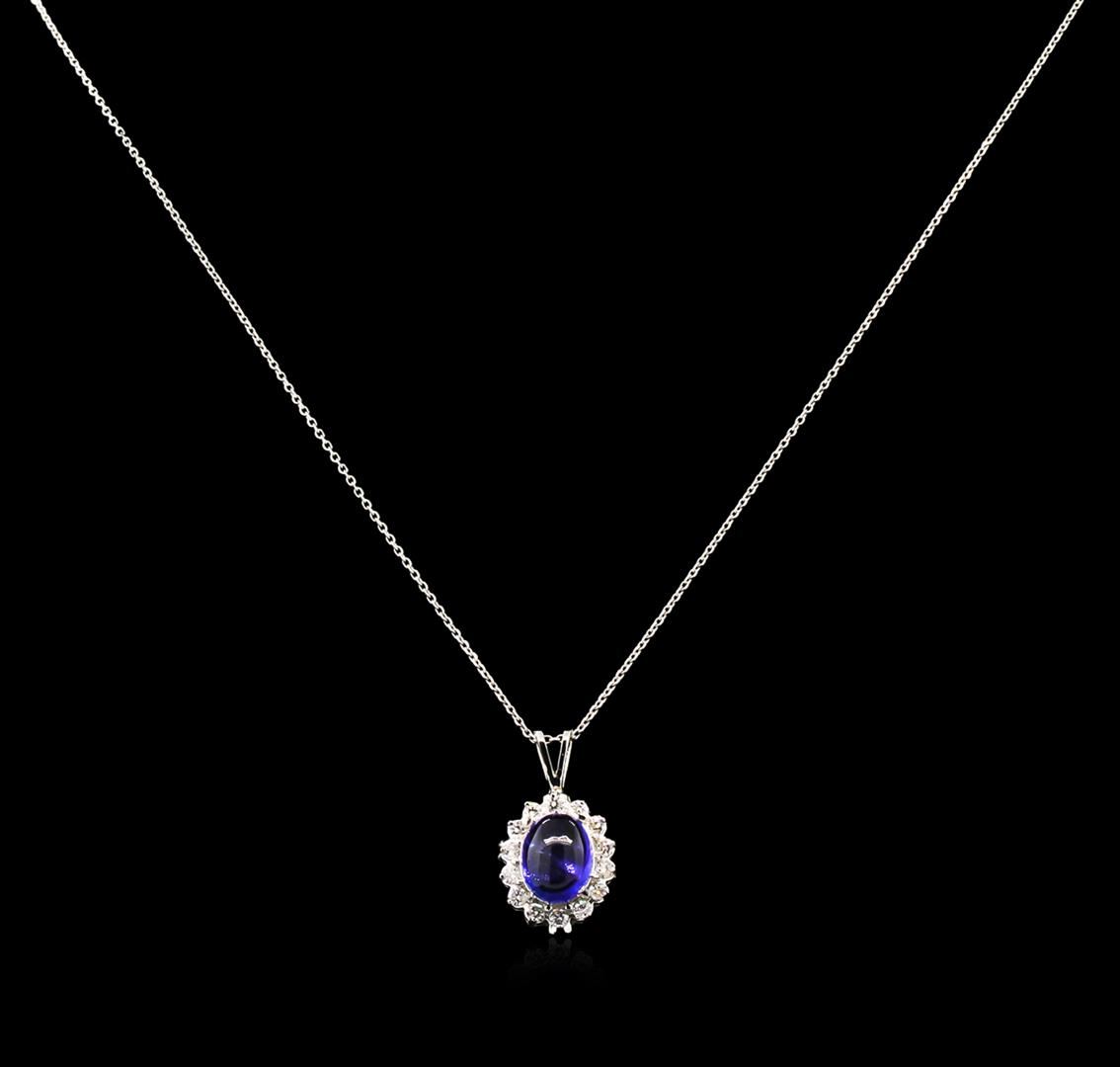 One electronically tested 14KT white gold lady's cast fashion pendant & chain 18.0" long, 1mm diamond cut cable link with a lobster claw clasp with a bright polish finish. Identified with markings of "14K". Condition is new, good workmanship. Containing: One prong set cabochon cut natural tanzanite, measuring 10.25 x 8.28 x 5.40mm, 3% bulge factor, approximate weight of 4.28ct., clarity is slightly included, type I, medium, very slightly grayish, bluish violet color, (GIA bV 5/3), cut is good. Transmitting light with a minimum of distortion, transparent. Colored gemstones are presumed to have been subjected to commonly used enhancement processes. Graded in the setting. Fourteen prong set round brilliant cut diamonds, measuring 2.20 - 2.10 x 1.35mm (depth est.) approximate total weight of 14 Stones = 0.53ct. Graded in the setting. Clarity: SI-2 to I-1. Color: H - I. Cut Good. Total Weight of Colored Stones 4.28ct. Total Weight of Diamonds 0.53ct. Total Weight of Pendant & Chain 4.90gm. GAS Appraised at $4,740.00.