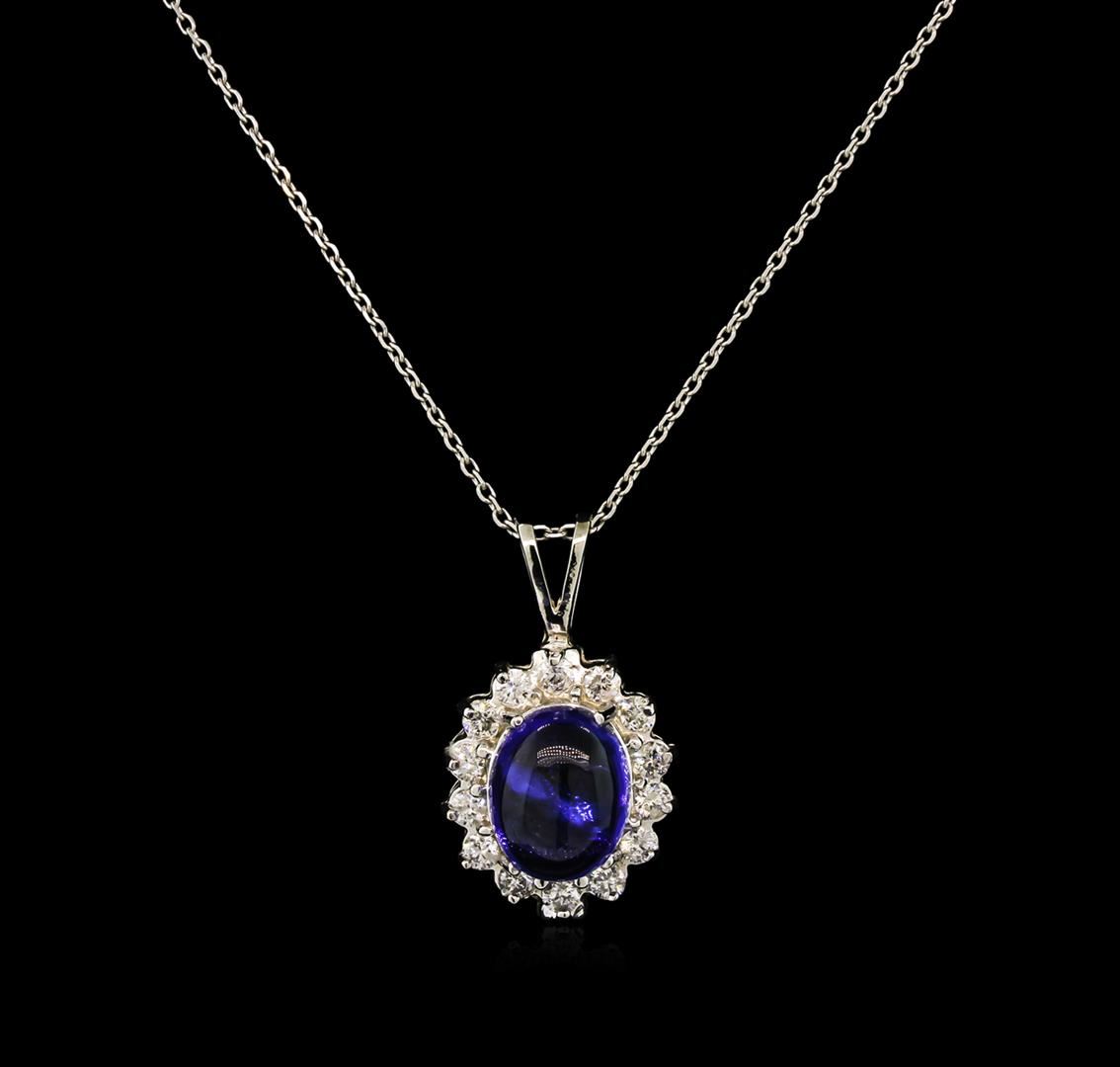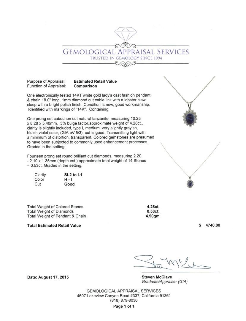 One electronically tested 14KT white gold lady's cast fashion pendant & chain 18.0" long, 1mm diamond cut cable link with a lobster claw clasp with a bright polish finish. Identified with markings of "14K". Condition is new, good workmanship. Containing: One prong set cabochon cut natural tanzanite, measuring 10.25 x 8.28 x 5.40mm, 3% bulge factor, approximate weight of 4.28ct., clarity is slightly included, type I, medium, very slightly grayish, bluish violet color, (GIA bV 5/3), cut is good. Transmitting light with a minimum of distortion, transparent. Colored gemstones are presumed to have been subjected to commonly used enhancement processes. Graded in the setting. Fourteen prong set round brilliant cut diamonds, measuring 2.20 - 2.10 x 1.35mm (depth est.) approximate total weight of 14 Stones = 0.53ct. Graded in the setting. Clarity: SI-2 to I-1. Color: H - I. Cut Good. Total Weight of Colored Stones 4.28ct. Total Weight of Diamonds 0.53ct. Total Weight of Pendant & Chain 4.90gm. GAS Appraised at $4,740.00.